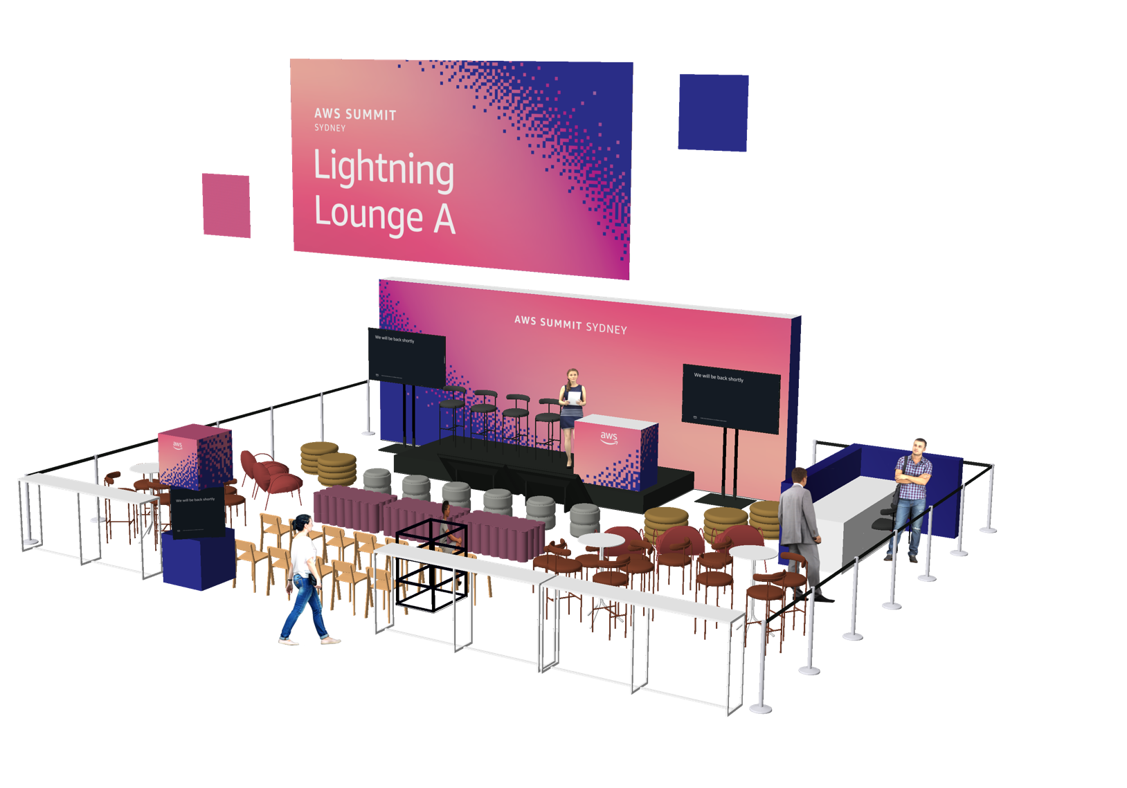 render this 3d model with realistic textures the context is an industrial expo location with polished concrete floor extremely dark space ceiling with barely visible trusses with several bright pink lights led cube stacked boxes do not alter the geometry and proportions of the 3d model