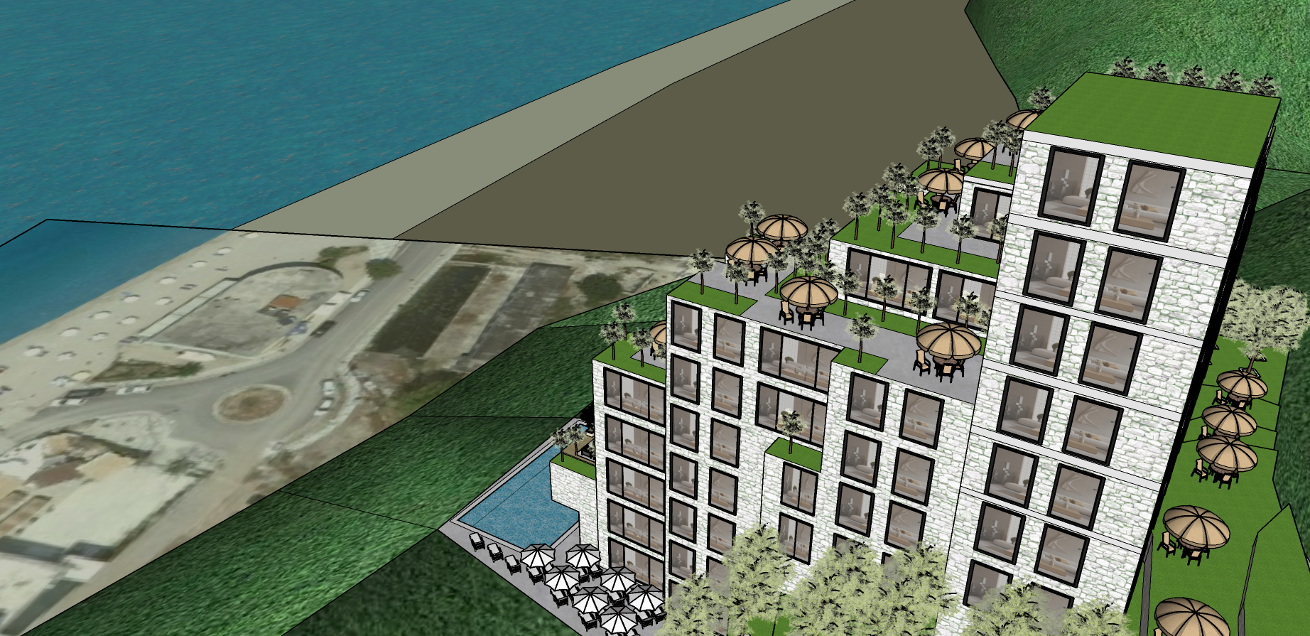 render a stunning architectural resort nestled in lush green mountains featuring cascading terraces with light grey stone walls put large tall and wide glass doors overlooking the terraces and also many windows in all the walls windows and doors have to prevail over the facade each terrace is adorned with vibrant green lawns and elegant parasols in soft beige the surrounding trees are a mix of muted silver and deep green foliage incorporate a luxurious inviting pool at the base with clear blue water the atmosphere exudes tranquility and harmony with nature with soft natural lighting emphasizing the serene setting please fill the surrounding hills with olive trees and some houses make it an elite residential zone render a stunning architectural resort nestled in lush green mountains featuring cascading terraces with light grey stone walls put large tall and wide glass doors overlooking the terraces and also many windows in all the walls windows and doors have to prevail over the facade each terrace is adorned with vibrant green lawns and elegant parasols in soft beige the surrounding trees are a mix of muted silver and deep green foliage incorporate a luxurious inviting pool at the base with clear blue water the atmosphere exudes tranquility and harmony with nature with soft natural lighting emphasizing the serene setting please fill the surrounding hills with olive trees and some houses make it an elite residential zone the resort is overlooking the sea the sea is on the left of the picture