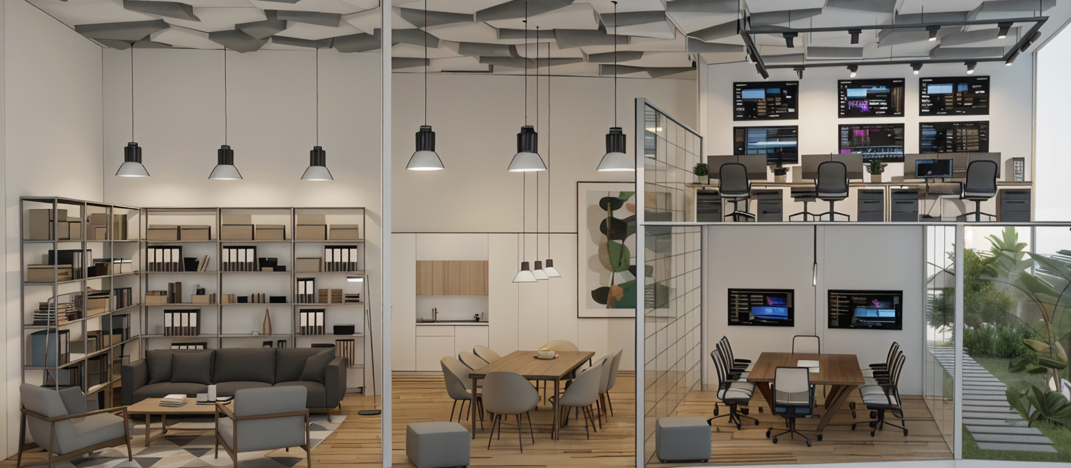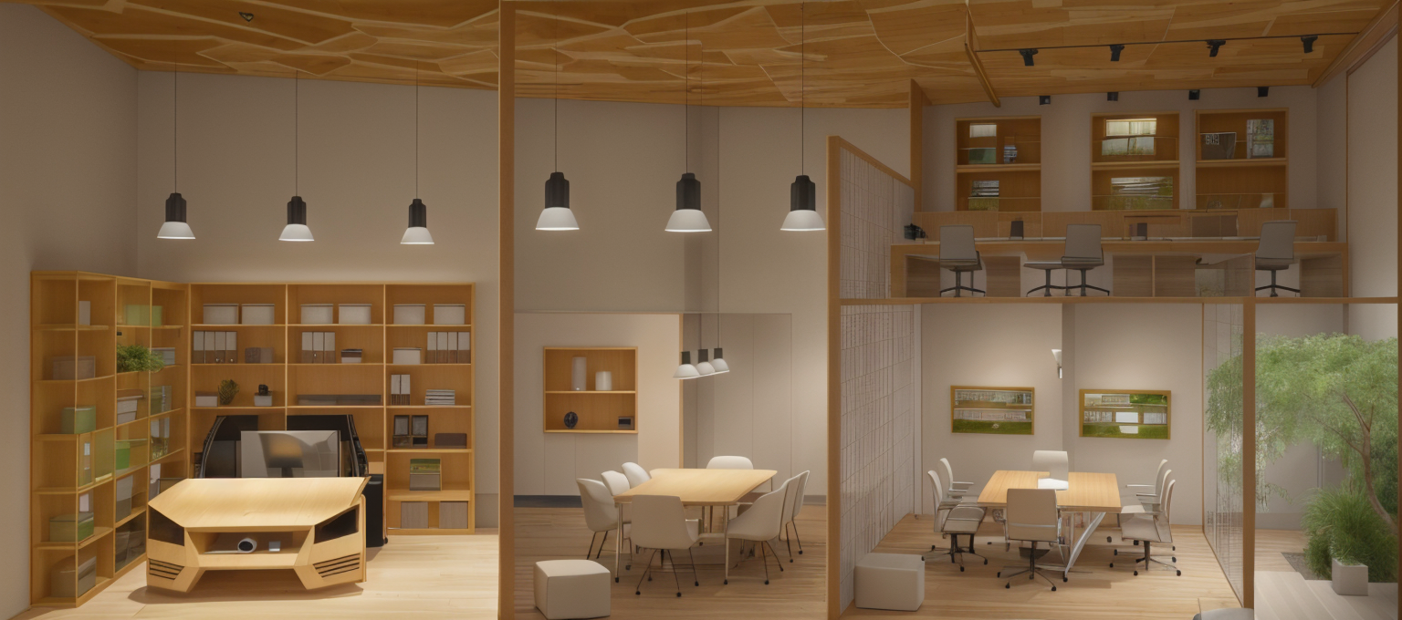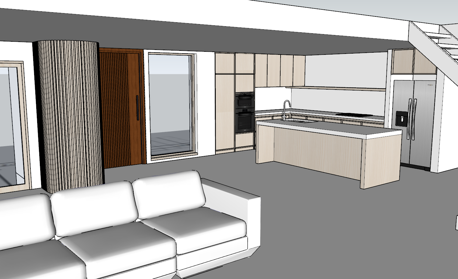 mediterranean revival interior shot a modern luxurious kitchen with a serene and sophisticated atmosphere the room features sleek oak cabinetry with fluted wood curved closet and a large island centerpiece made with natural white oak with light beige granite countertop and backsplash of the same material the walls are clad in a soft warm white complementing the cabinetry appliances are seamlessly integrated adding a touch of contrast overhead lighting is warm and ambient with recessed ceiling lights creating a cozy yet refined ambiance the flooring is parquet concrete enhancing the airy feel of the space sparse greenery adds a hint of freshness while maintaining the minimalist and clean design outdoor light from the left hand side window window view is of trees architecture