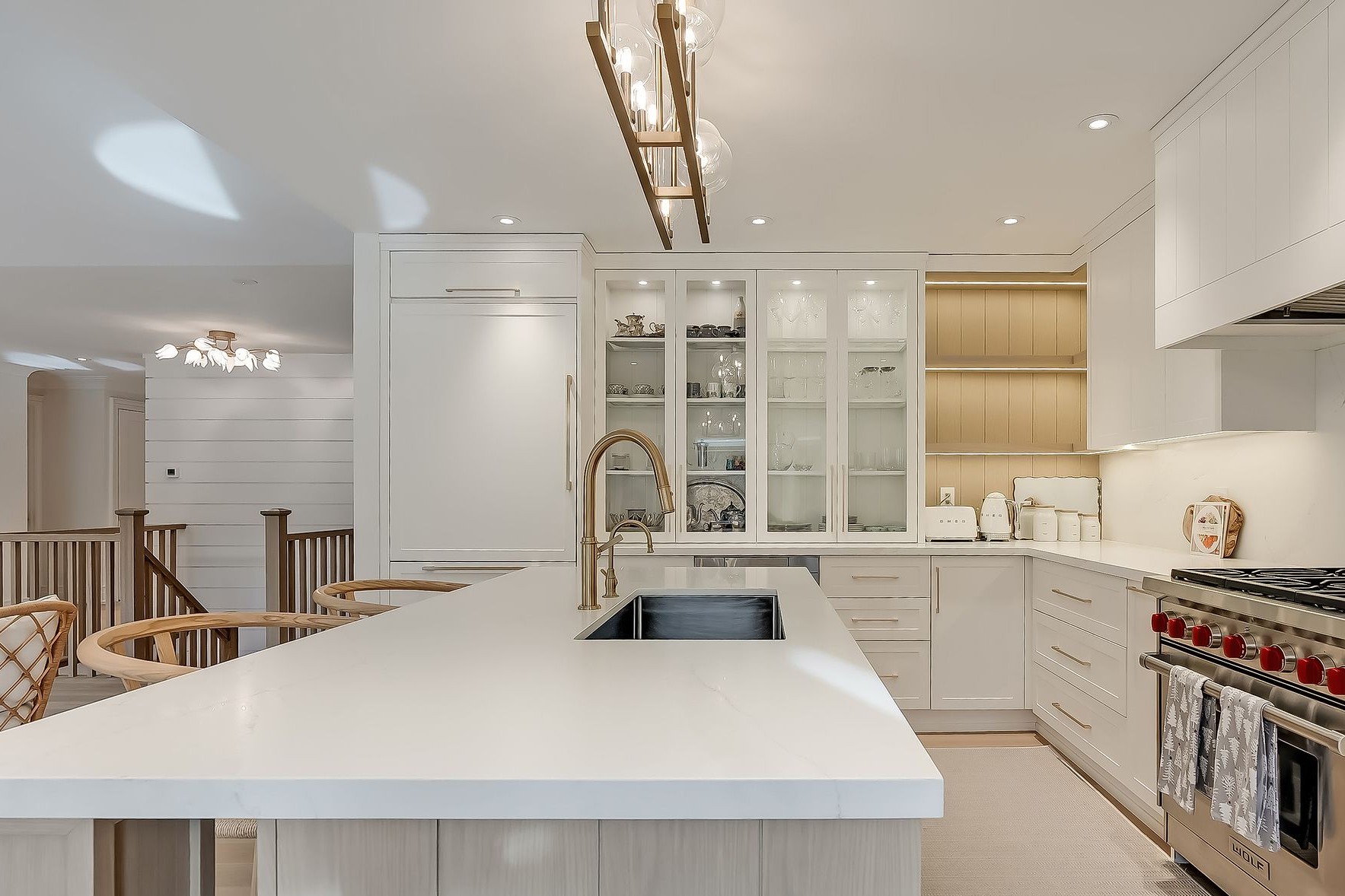 enhance this kitchen photo to feel like an editorial interior design photograph keep all architecture cabinets and fixtures exactly as they are make these specific changes add a mid size dramatic branch arrangement sparse flowering branches cherry blossom or quince style in a simple white ceramic or stone vase placed on the kitchen island left side of the sink warm the overall lighting reduce the harsh bright overhead pot lights bring in softer warm ambient tones increase contrast and depth slightly more shadow in corners less flat exposure style the island remove any clutter keep only the vase with branches overall mood reference warm organic quiet luxury not bright realtor photography 4 5 portrait