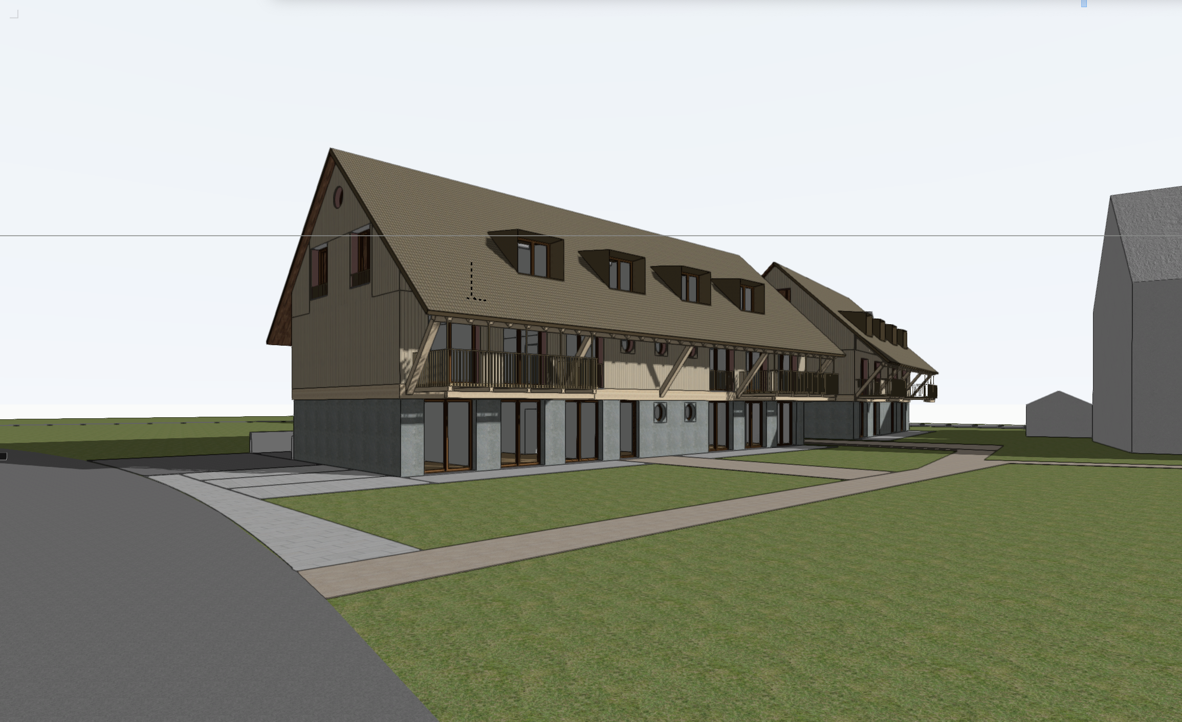 create a realistic photograph of an exterior image in a plot near a swiss village the roof has dark orange roof tiles the base walls of the building are plaster in green grey color the first floor is in wood panels the garden has nice and tall gras keep the geometry of the building