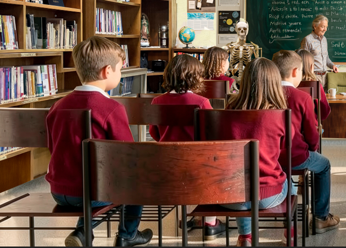 put one kid sitting with his back facing forward in a chair 10 years old wearing a red sweater uniform