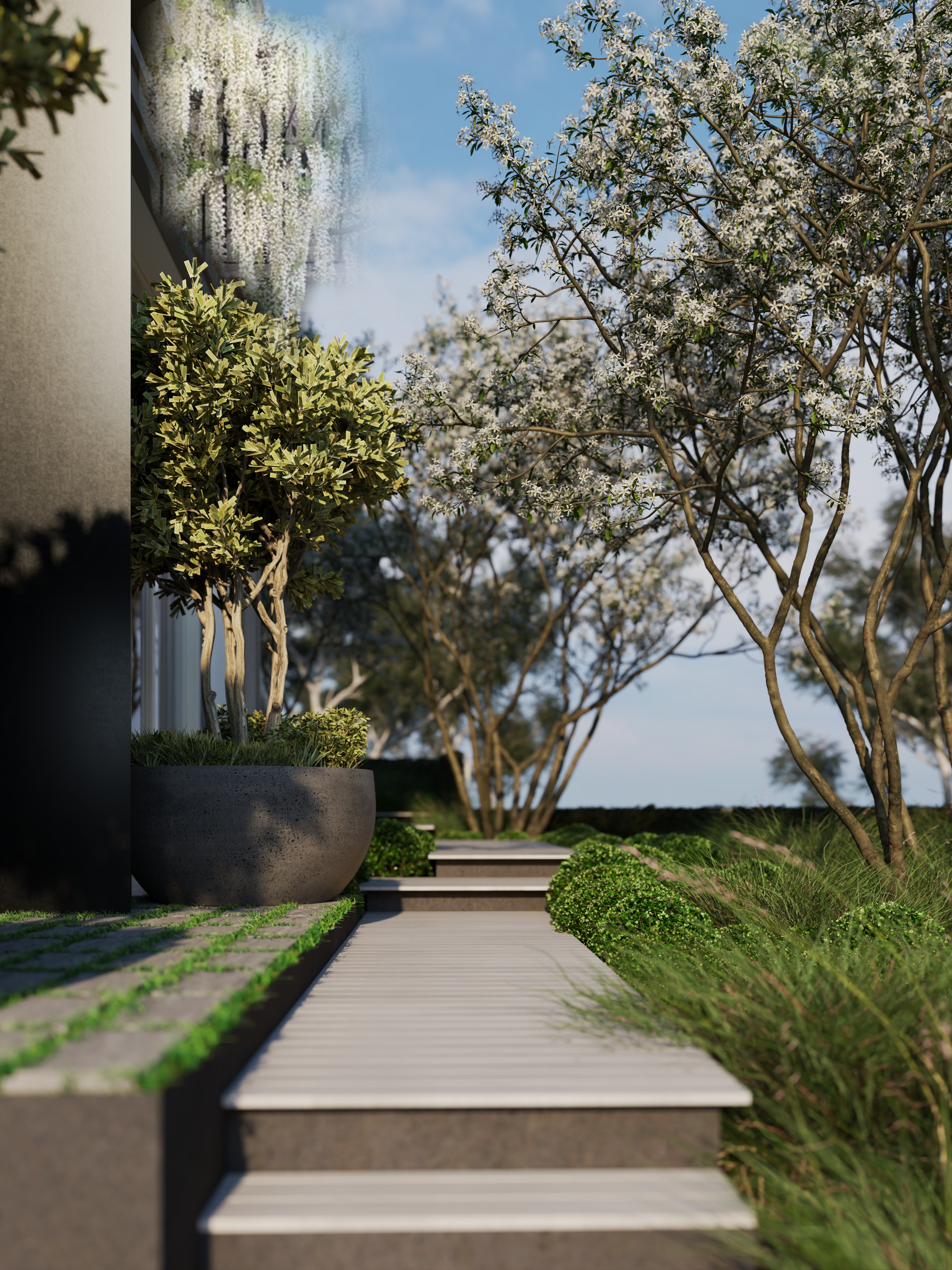 render into real image and keep it composition same make it blend vegetation with environment soft dawn light ambience fix the white wisteria vines to be more natural