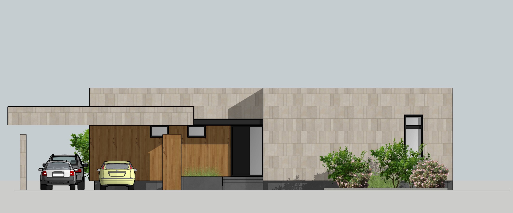 modern house clean minimalist lines natural facade materials wood stone glass japandi style subtle warm lighting realistic vegetation professional architectural visualization