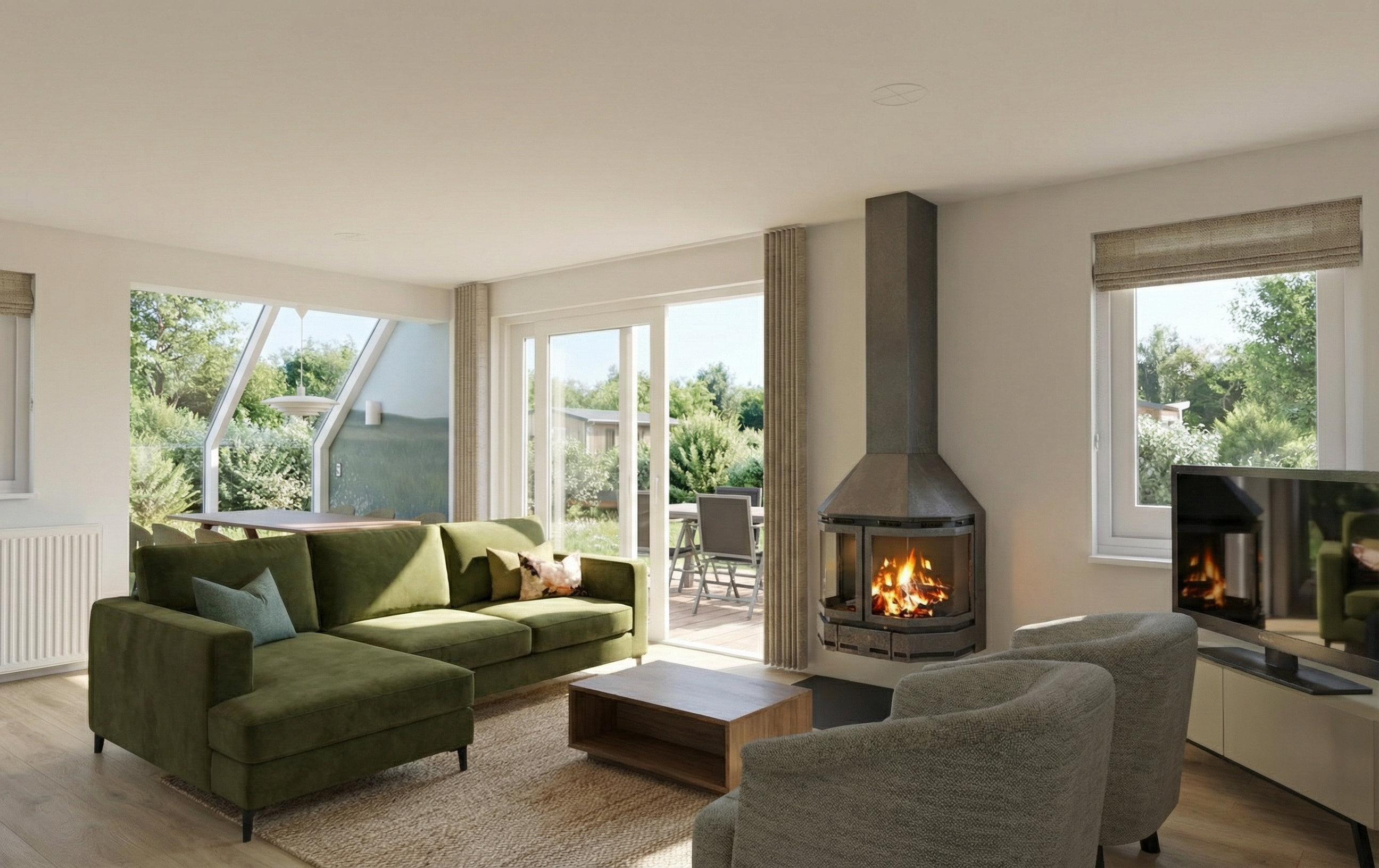matching vacation rental houses keep the windows doors everything the same as it shows don t change anything about the buildings dark brown architectural shingle roofing black trim around the roof windows and doors cedar colored 5 horizontal vinyl siding built into a hill asphalt parking lot with people removing luggage from the vehicles and walking towards the house green grass lawn surrounded by trees in the middle of a woods and bright sunny day