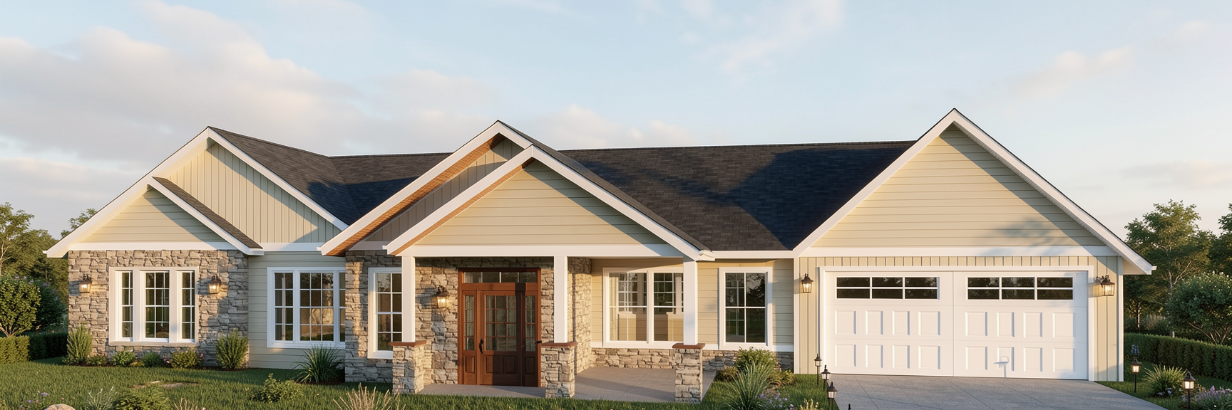 improve render sunny light no bloom remove bloom keep all design materials colors and composition unchanged hyperrealism add californian style houses roofs behind the fence and low oak trees