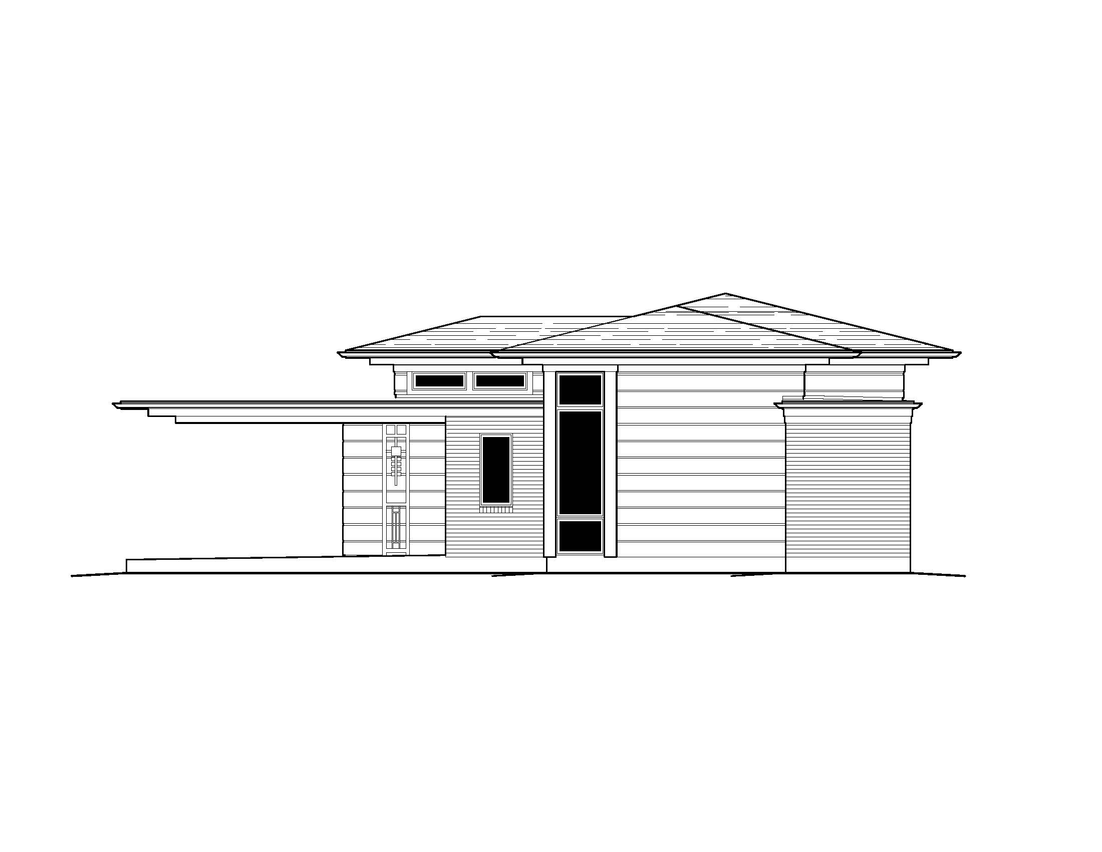 central texas hill country usonian architectural style natural horizontal wood siding thin brown roman brick all openings shown are windows gravel driveway going to carport on left native vegetation around base of house no posts on left side of roof pickup truck in carport on left support on porch is open steel not a window delete posts under roof on left side of house exterior lighting off