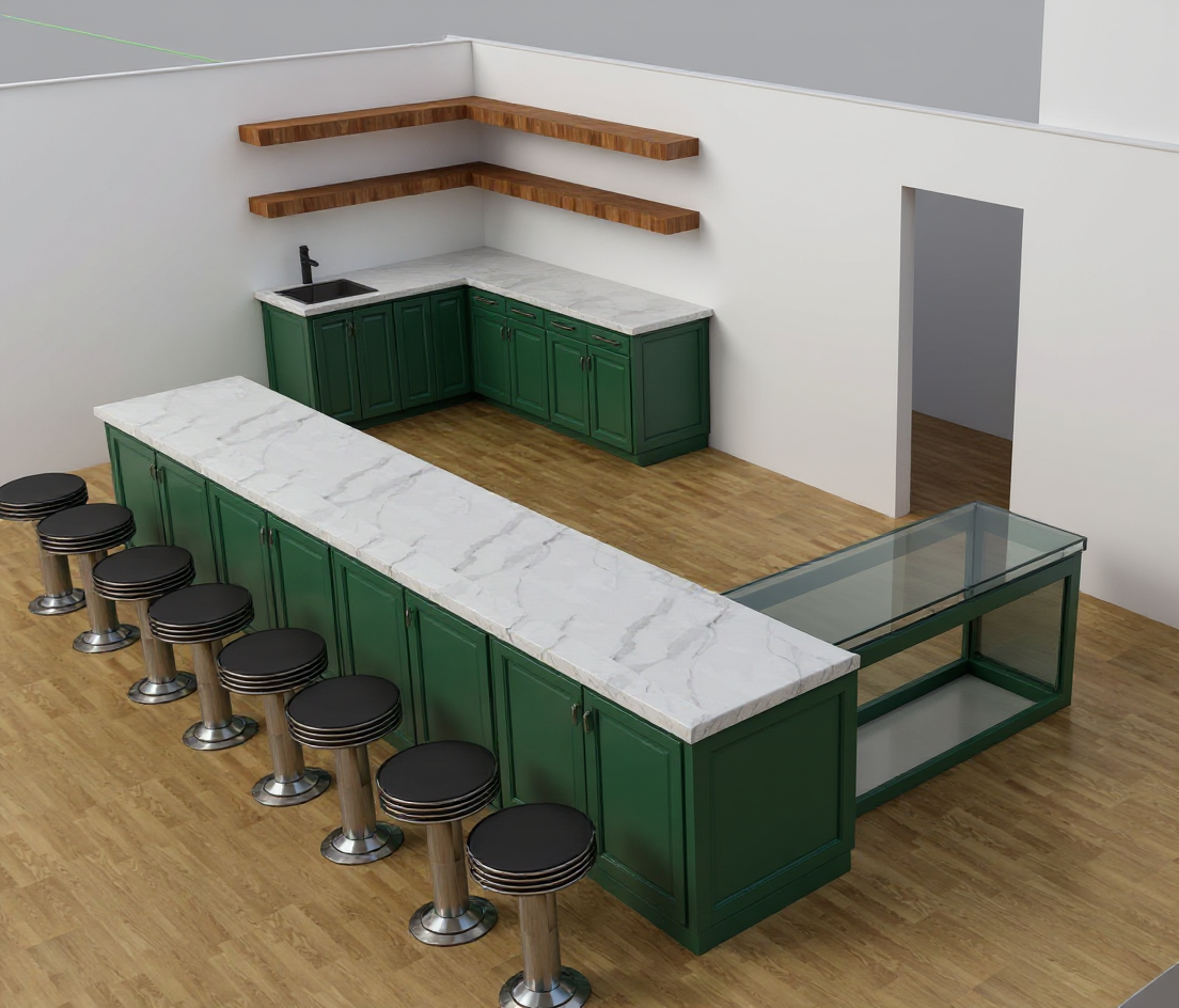 keep everything as is but add an open shelf to the island on the left side only extend theb island to add this the open shelves are part of the island