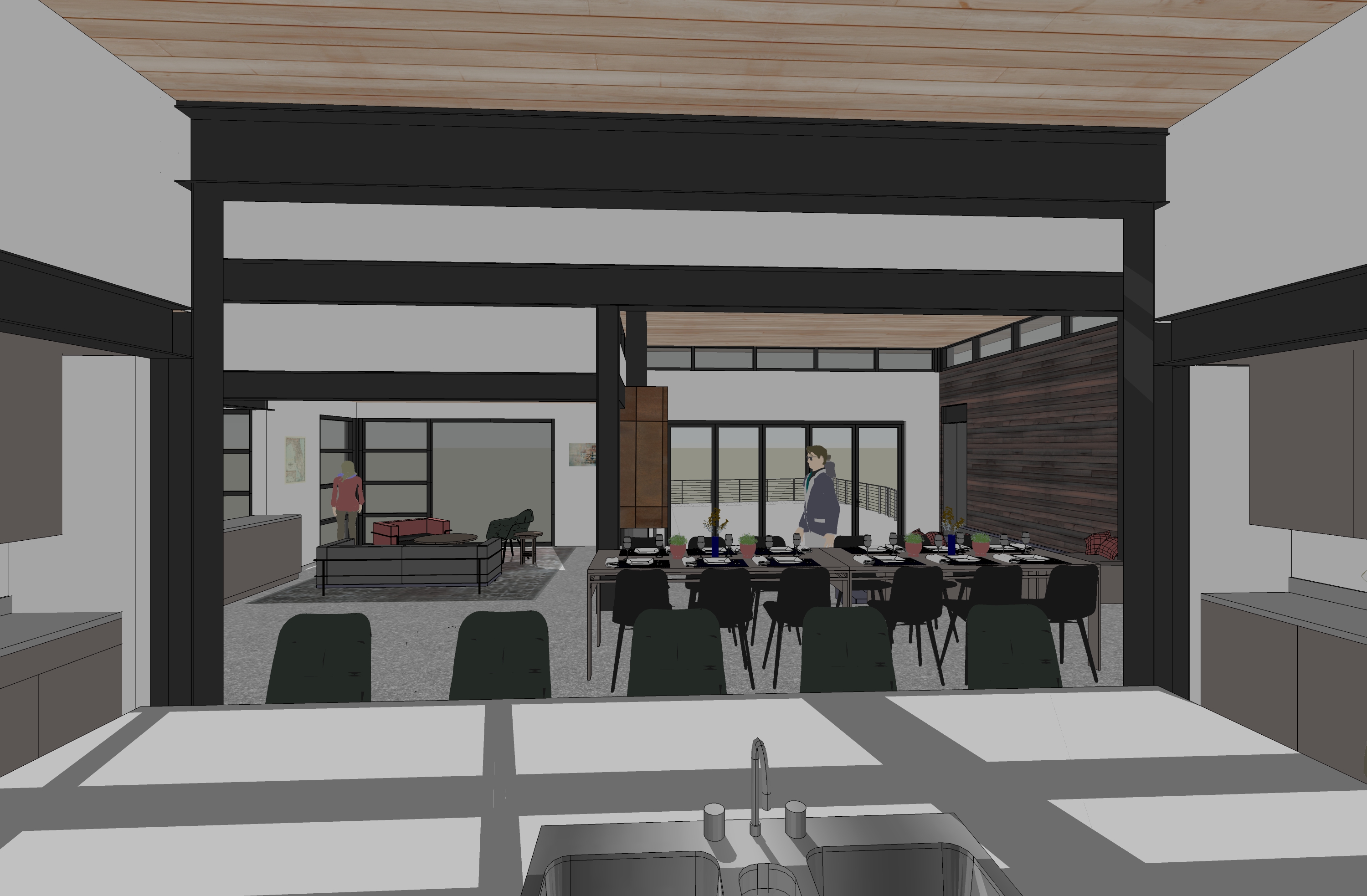 interior view matte gray concrete floors wood ceiling matte black steel framing matte dark wood cabinetry matte wood countertop