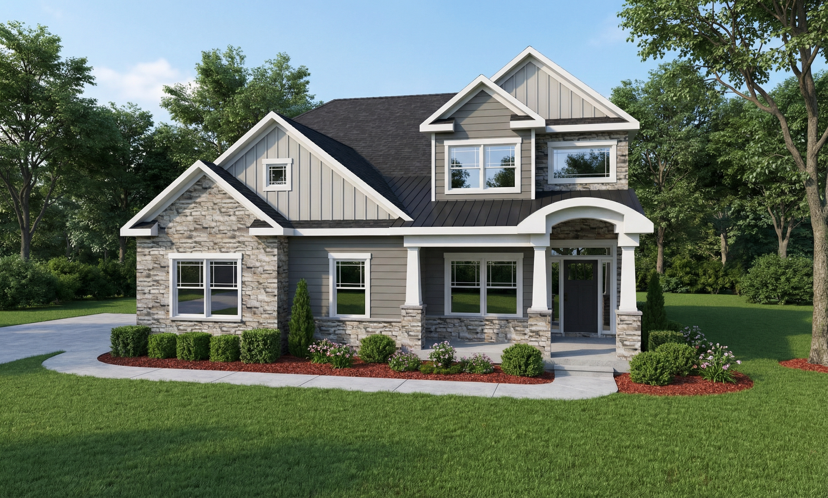 grainy watercolor render of timber frame building with reclaimed wood siding and stone wainscot watercolor in the background extensive watercolor landscaping surrounding the building