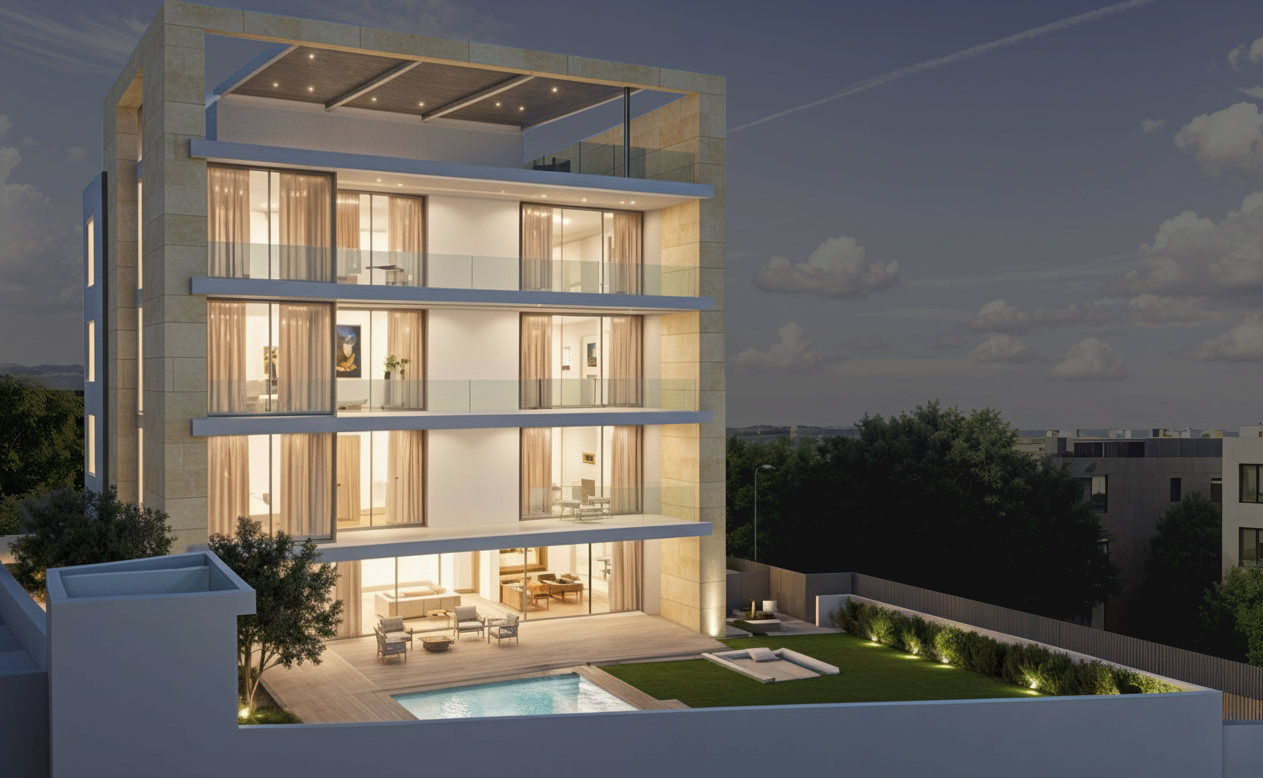 replace all existing beige stone fa ade surfaces with the uploaded travertine texture material use the uploaded texture exactly as the new fa ade material keep its natural warm beige color soft variation and matte finish do not change the color tone or saturation avoid visible tiling or repetition make the texture seamless scale the texture proportionally to large architectural panels not small tiles keep grout lines minimal and subtle application apply the new stone texture only to the fa ade areas that previously had beige stone do not distort or stretch the texture align panels naturally and evenly across all floors lighting maintain bright soft daylight with no harsh shadows so the stone reads clearly restrictions do not modify the building geometry do not change any other materials glass white plaster metal panels concrete do not change the environment or camera angle only replace the beige fa ade stone with the uploaded travertine texture