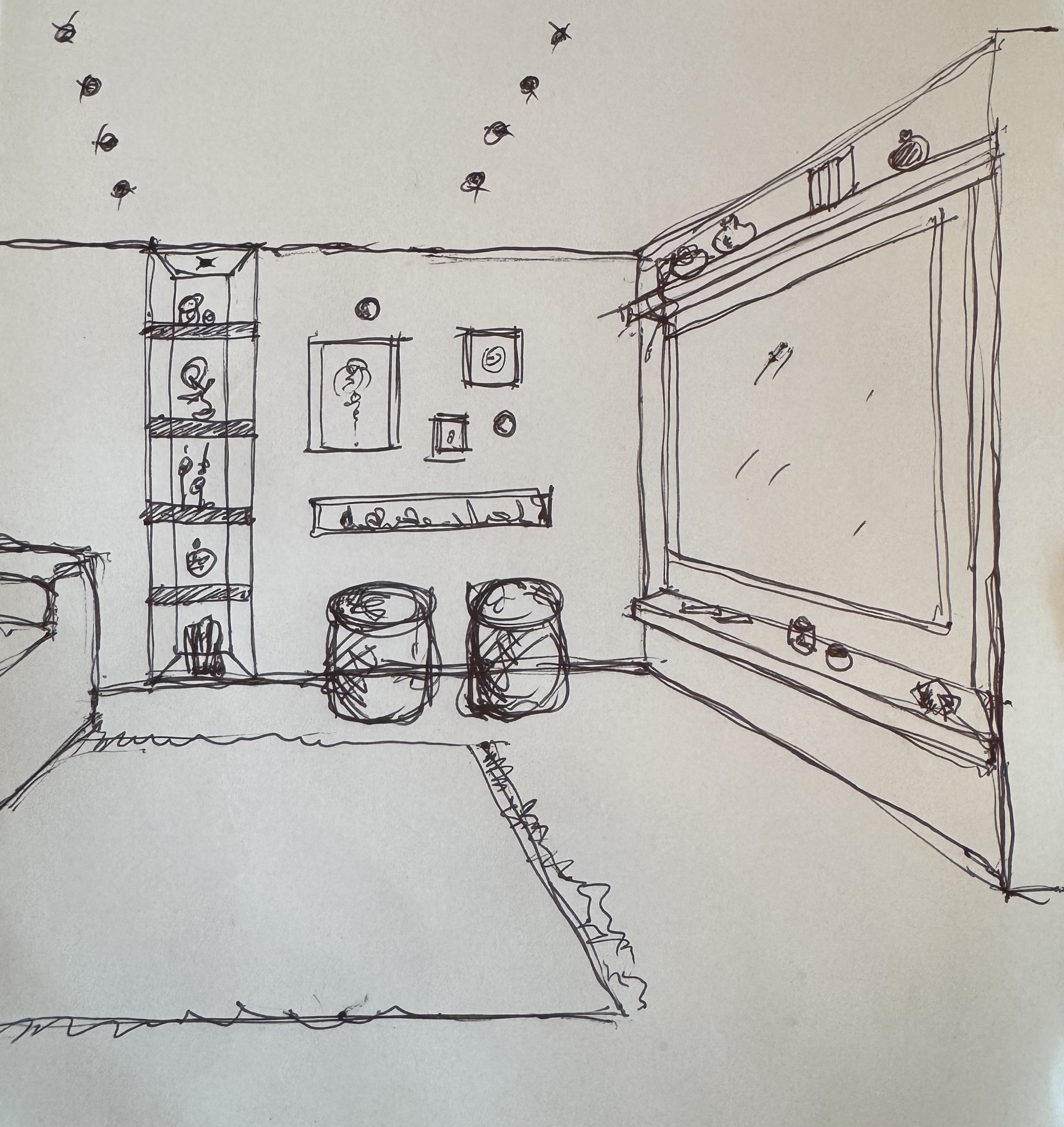 show a corner of a living room with a large tv and a wood shelf above and below it then the perpendicular wall has a narrow fireplace and art frames above it to the left of that is a floor to ceiling niece architecture