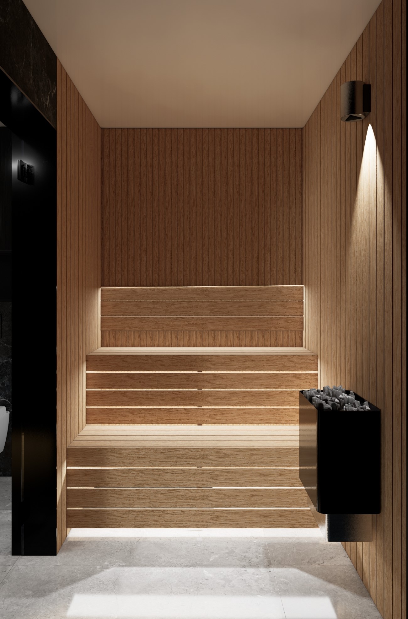 create a photorealistic image add lighting replace materials with photorealistic real materials add some slight reflections and shines to materials insert an ies light cast replace soft materials and cloths for high end real like materials add a person to the image girl having leisure time in sauna motion blurred as a long exposure
