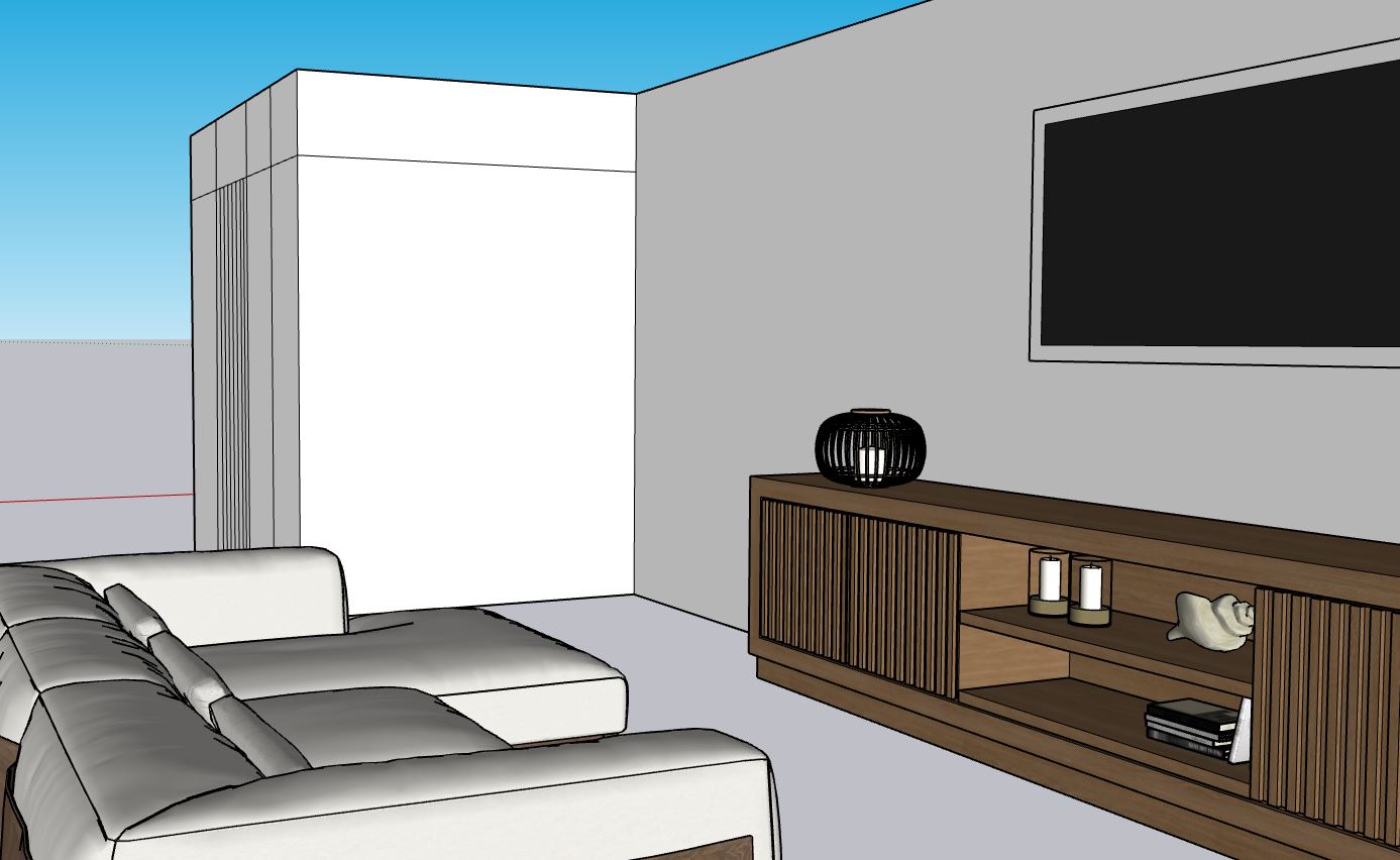 create a highly realistic japandi living room interior render strictly based on the provided sketchup layout and camera angle overall design concept japandi wabi inspired minimalism calm warm uncluttered timeless focus on natural textures softness and functional beauty tv feature wall no carpentry tv mounted on a plain limewash plaster finish wall wall color warm off white soft beige light clay tone subtle limewash texture with natural imperfections matte finish no panels no fluting no storage clean and minimal backdrop for the tv tv console only carpentry on tv side low profile japandi style tv console light oak warm ash wood tone matte finish simple horizontal proportion combination of fluted sliding doors open shelves slim recessed plinth for floating effect minimal d cor ceramics books neutral objects storeroom wall storage niche hidden door full height built in storage carpentry at storeroom wall finished in matching warm wood tone same as tv console one section functions as a hidden storeroom door fully concealed within the carpentry door flush with panels no visible handle push to open or shadow gap door lines aligned seamlessly with surrounding panels curved niche design integrated soft curved arched niches within the storage carpentry rounded edges organic japandi proportions niche interior finished in light plaster microcement texture warm concealed led lighting inside niches 3000k styled minimally with ceramic vases or branches flooring large format creamy porcelain tiles cream beige cream grey undertone matte or soft satin finish minimal grout lines for seamless look furniture styling low japandi sofa in cream warm grey fabric soft cushions linen textures minimal d cor strong negative space lighting soft natural daylight warm recessed downlights 3000k gentle ambient lighting highlighting plaster texture and niches calm shadow play no harsh contrasts rendering style ultra realistic materials and lighting soft contrast warm color temperature natural wood grain realistic plaster texture calm editorial quality realism camera match sketchup perspective exactly eye level view focus on limewash tv wall console and storeroom niche details natural field of view no distortion