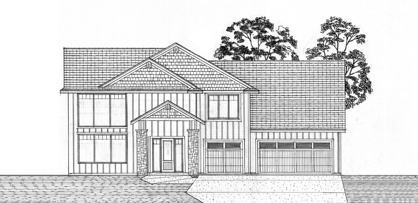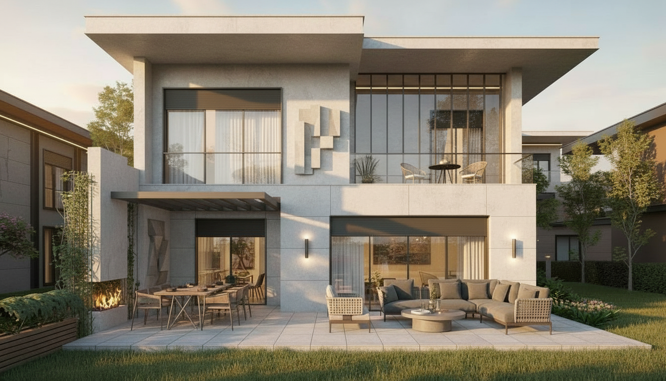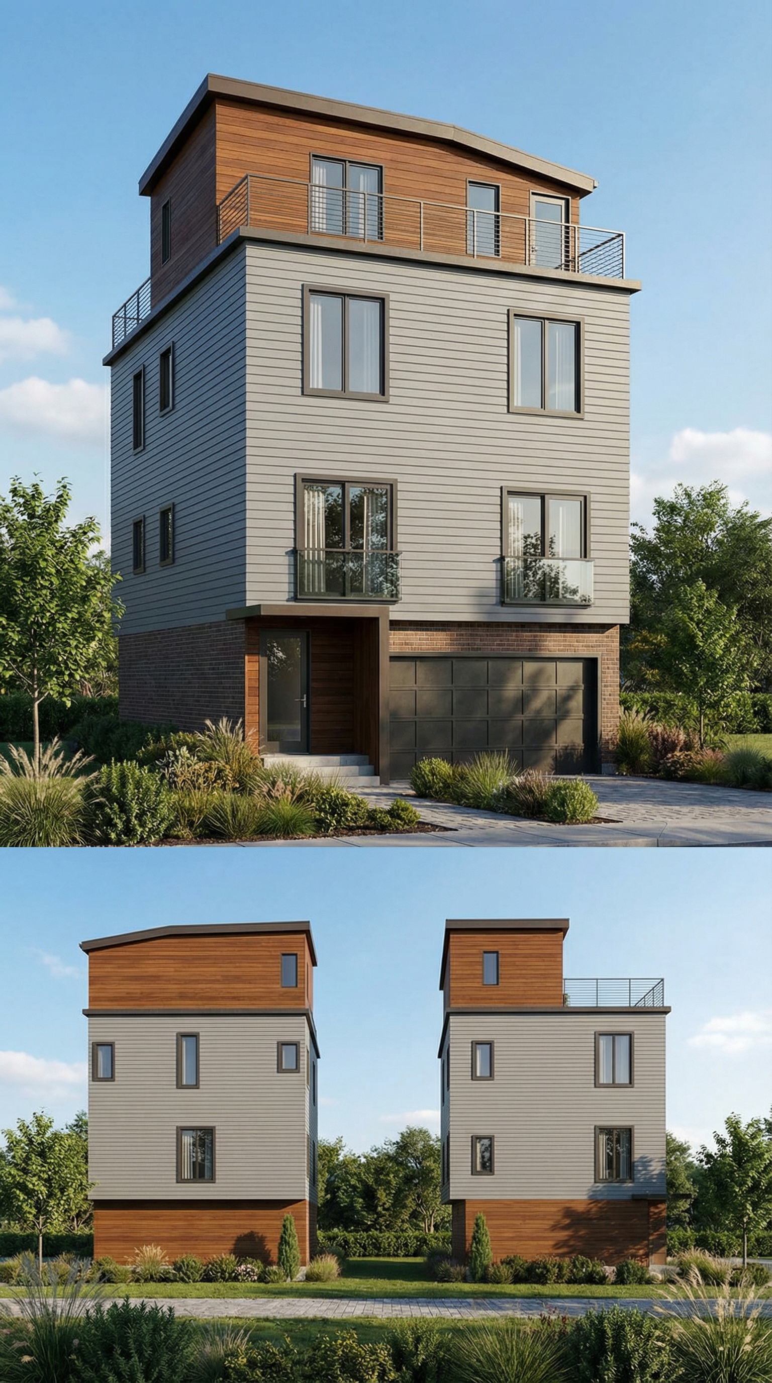 render a modern two story house with a gabled roof and large windows use a soft white and light gray color palette for the siding with dark gray accents on the roof tiles add natural stone detailing around the entrance in earthy tones the front door should be a rich warm wood color place lush green trees in the background and ensure the driveway is made of smooth light gray concrete create a serene and inviting atmosphere with clear blue skies and soft natural lighting