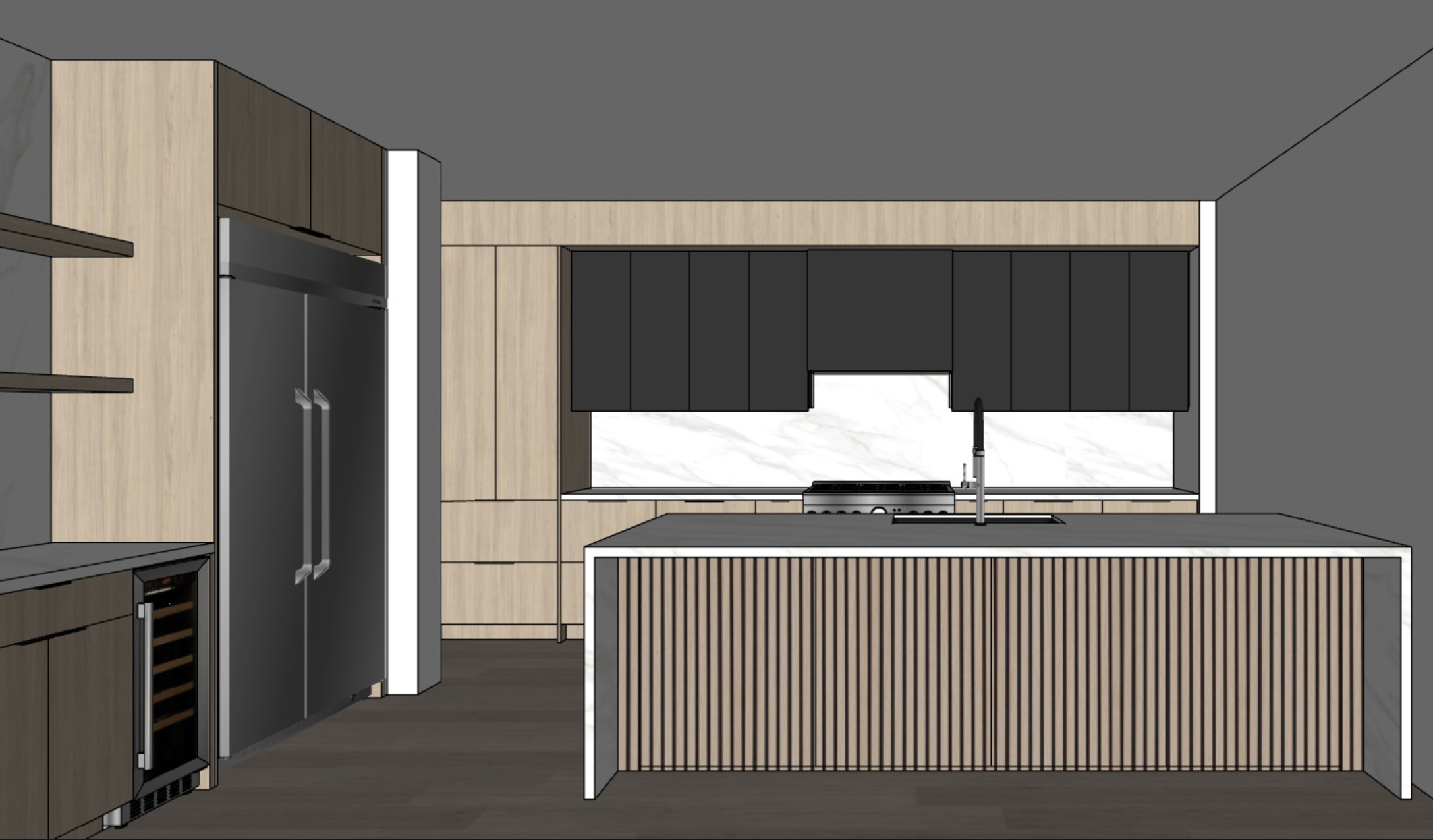 make it to look realistic oak medium cabinet finish add yndermount led lighting on upper cabinets and floating shelves carry the countertop slab up the wall for backsplash fluted paneling on the island add toe kick lighting on thall of the base cabiets and lighting above the black cabinets the floor is a warm sandy wood color stainless steel appliances
