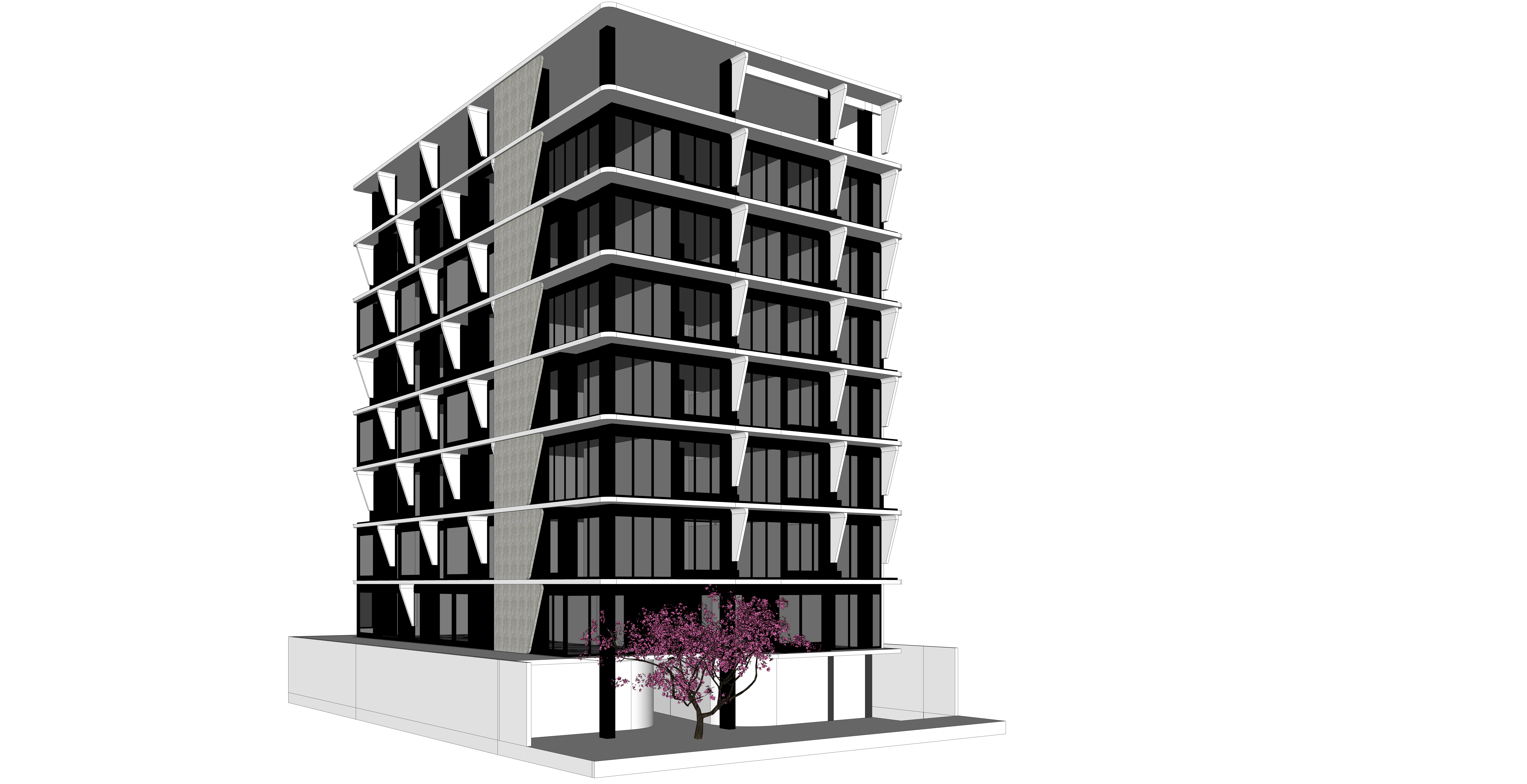 render a modernist architectural building with sleek angular lines use a palette of light gray for the concrete deep charcoal for the window frames and reflective glass the building should stand in an urban landscape with a clear blue sky and warm sunlight to create a bright and inviting atmosphere add subtle shadows for depth and dimension highlighting the building s geometric design