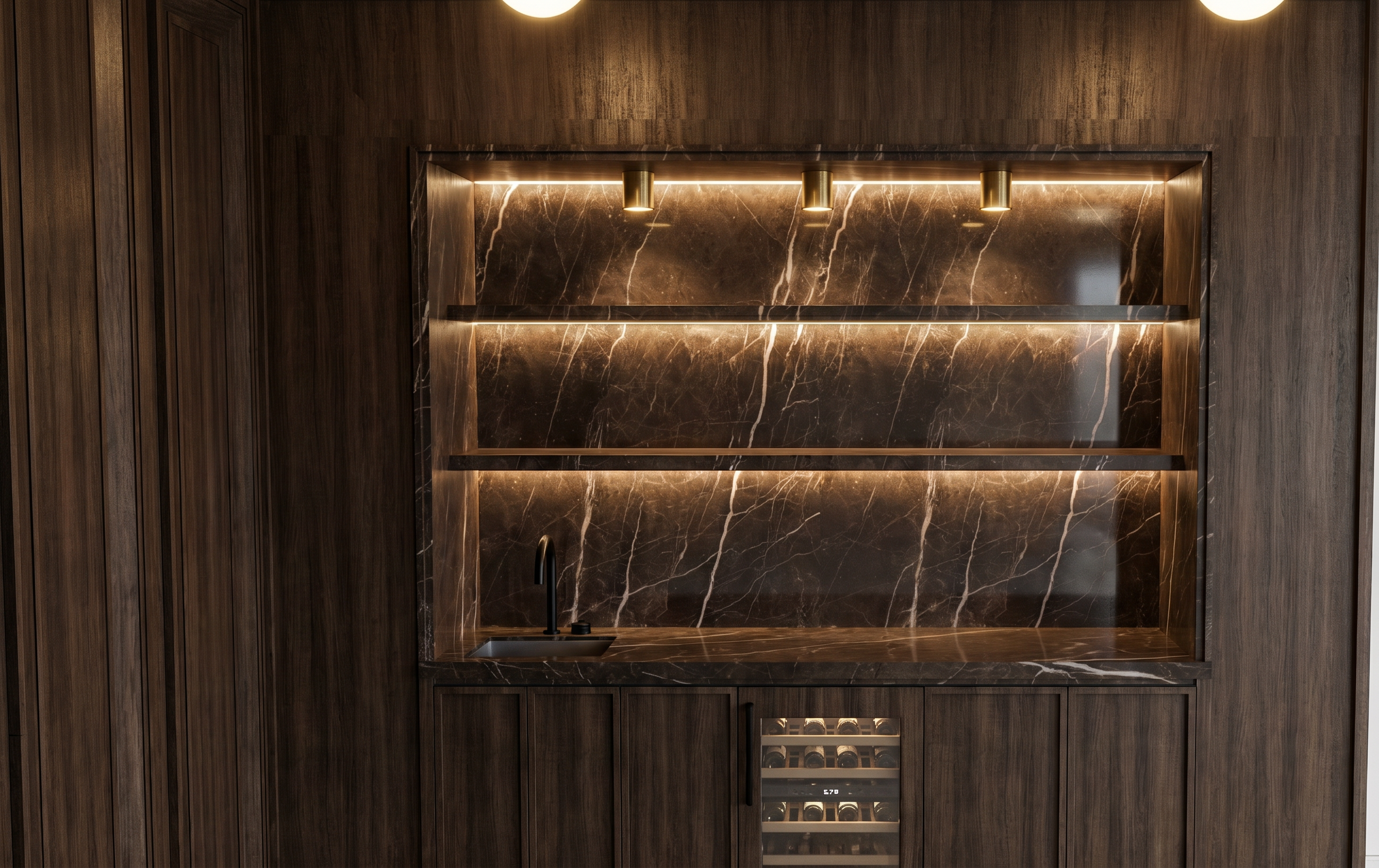 provide a photo realsitic render op the landscaped garden with subtle strip lighting under all stair nosings ensure to show subtle lighting for lighting units on fences just after sunset show the fire on the firepit table show a open plan kitchen dining space behind the doors in the distance remove random downlighters go by the orignal image remove lighting from under pavers