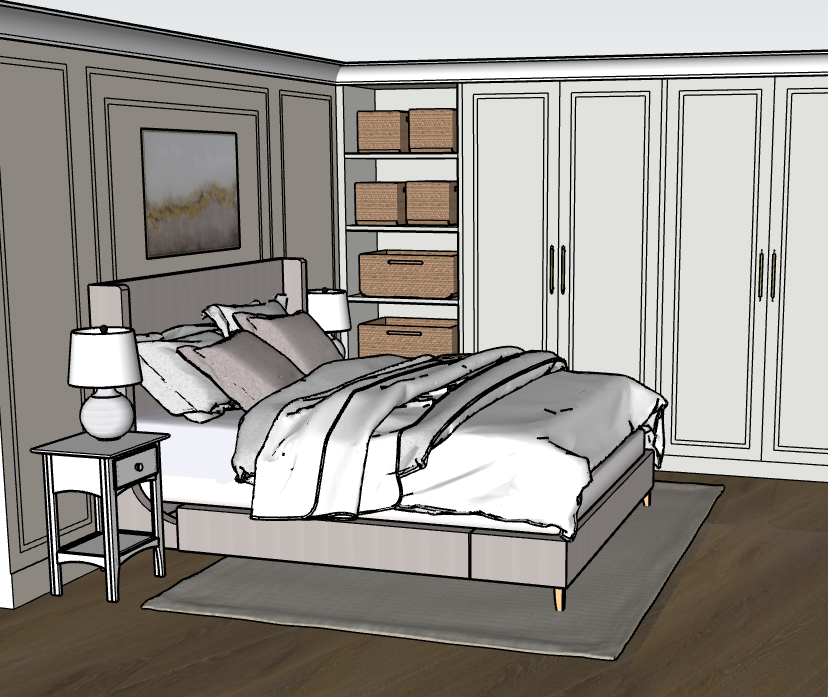 table lamps on either side of the bedside are on led lights on in shelves with baskets flush spotlights on in the ceiling