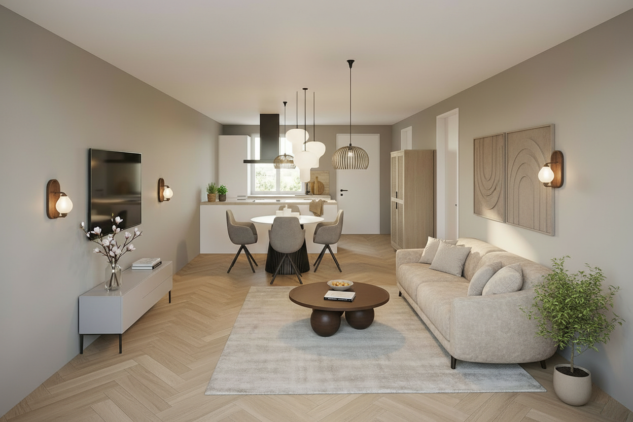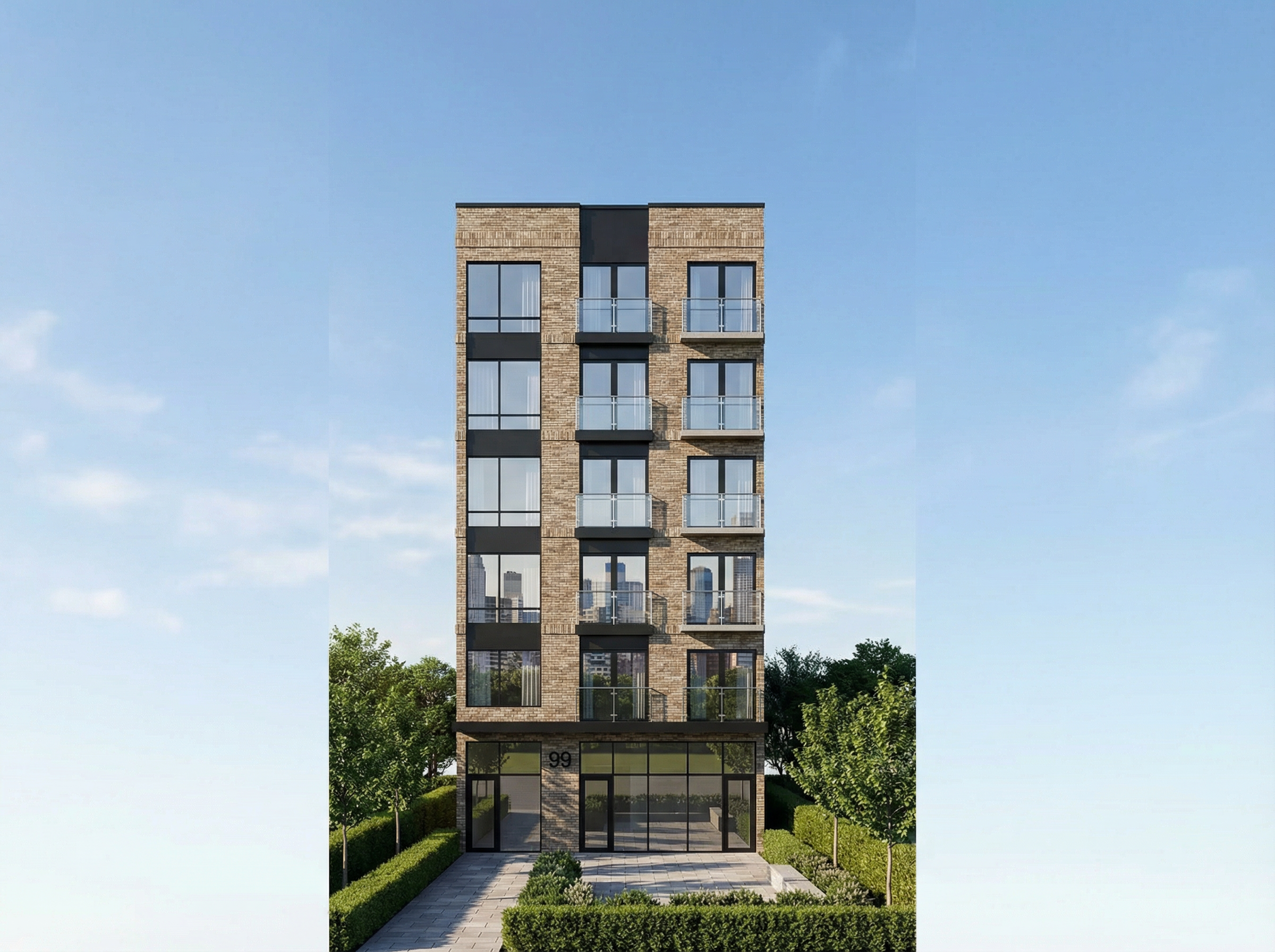 render a modern urban apartment building with a sleek design the building facade is composed of light beige bricks with subtle texture the large windows reflect a clear blue sky adding a touch of transparency balconies are adorned with glass railings accented with stainless steel the entrance area features dark gray doors with minimalist designs the building number 99 is prominently displayed in a bold black contemporary font create an atmosphere of a bright sunny afternoon with soft shadows enhancing the building s features with a twilight effect