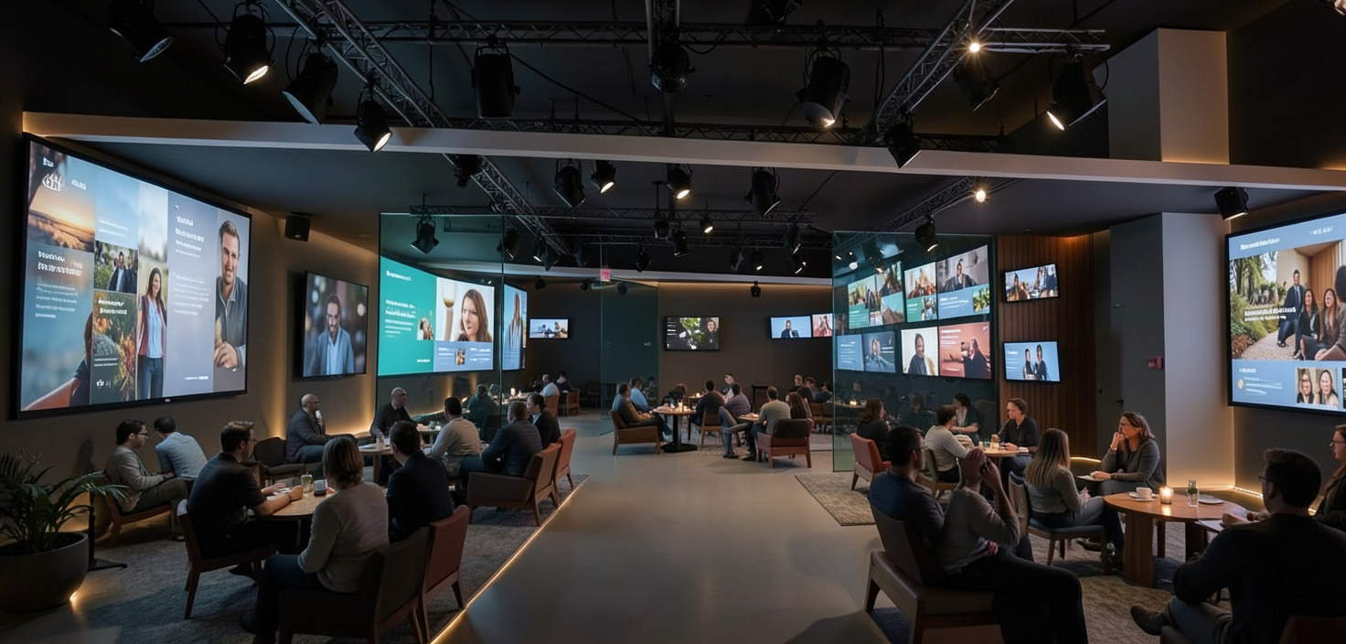 multi sized monitor of personalities displays stories soft lighting seating areas with people dark room seperate individual seating areas soft perimeter lighting floor to ceiling monitor back wall adjustible studio lighting and projecters at ceiling glass partitions with video on glass random monitors floor to ceiling monitor areas random seating