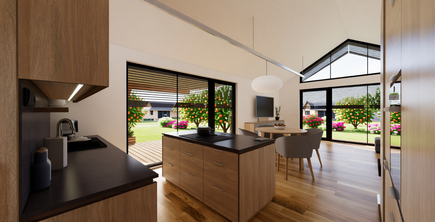 generate hyper realistic visual but with artistic flare of this cad model dont change the view but just make it look real the blue is a balancing pond as is the white area in the foreground with wild flower planting the green structrues are native uk trees make the footpath in a buff colour and add people walking and cuclists make the grass on the fields a little bit wild with some wild grasses as this is for bng make the houses in the distant out of brick and flint and black timber cladding all slightly different but all with grey slat roofs add birds int he sky and some subtle biodiversity in the landscape to make it look naturalistic and welcoming to nature