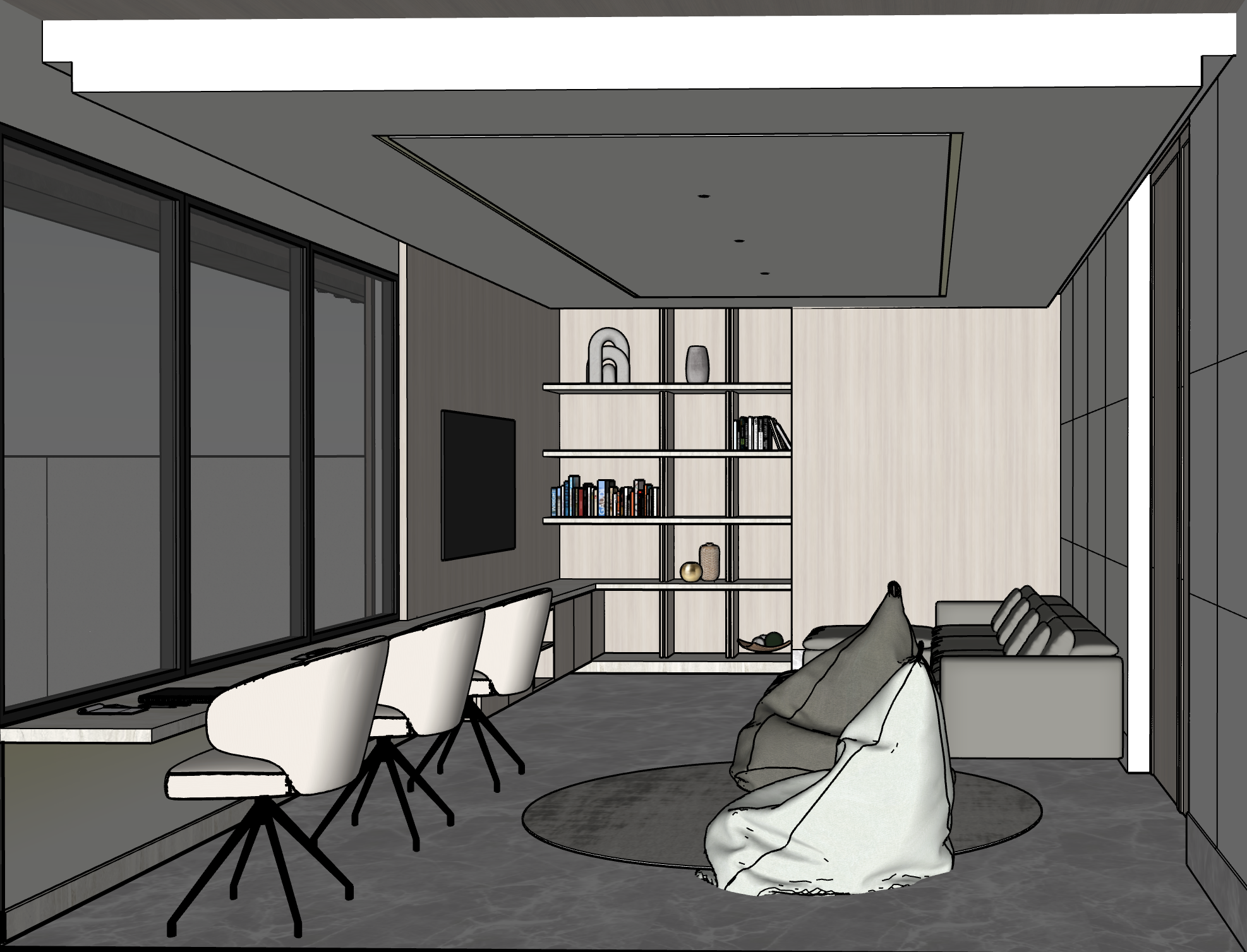 modern study and lounge interior render with a calm sophisticated atmosphere large windows along the left wall black slim profile frames and diffused natural daylight with a view of the perimeter wall and a piece of a light blue realistic sky above the perimeter wall long built in desk with a beige travertine surface and three upholstered swivel chairs in soft cream fabric at the back a minimalist shelving horizontal in beige travertine vertical pieces in light wood unit in light wood with decor pieces and books adjacent to a wall mounted tv a contemporary modular sofa in neutral gray stands on the right paired with two relaxed beanbag over a round gray rug silver marble flooring warm wood panel accent wall and a recessed white ceiling with indirect lighting and small downlights finally a right wall with a reticular pattern in light beige paint and a light wood door clean lines soft neutral palette photorealistic textures and a refined serene architectural visualization style