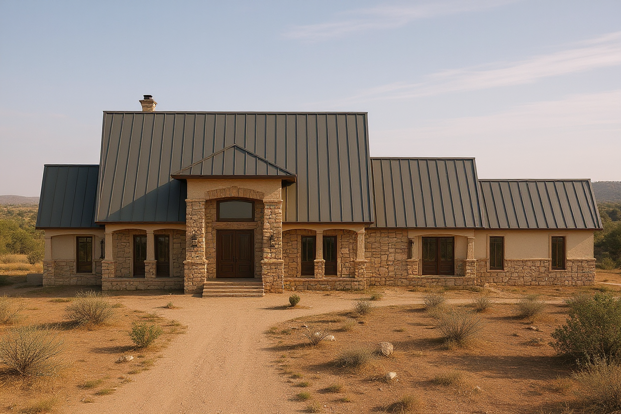 white limestone light cream stucco tapered columns central texas metal roof horse farm large circular gravel driveway