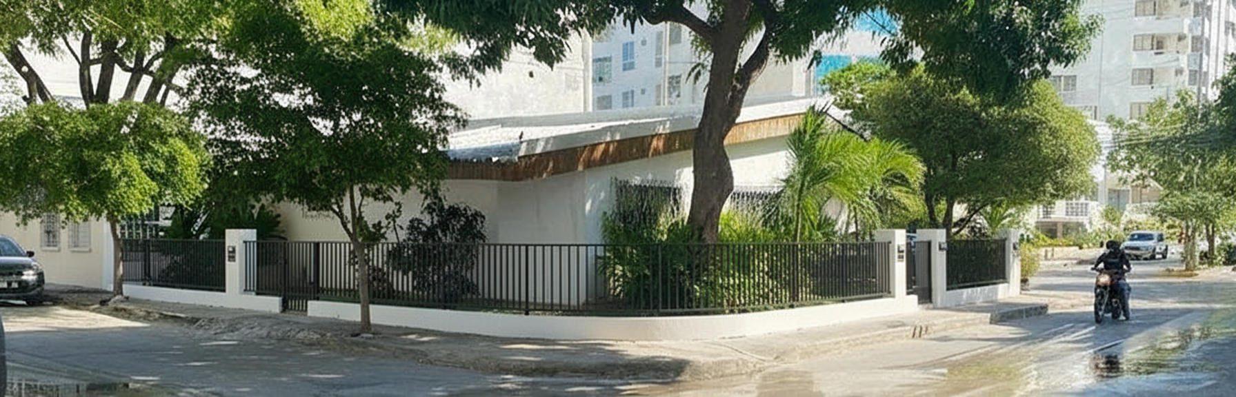 edita la imagen proporcionada y haz que la casa se vea claramente pintada de color beige con un acabado de pintura reciente cambia el color de todas las paredes exteriores a beige manteniendo la estructura texturas sombras y detalles originales elimina el muro bajo de cerramiento existente y reempl zalo por una reja de cerramiento moderna de aproximadamente 2 5 metros de altura t pica de casas contempor neas de santa marta colombia mant n la entrada existente peatonal y o vehicular y dest cala mediante un elemento arquitect nico moderno como un p rtico marco volum trico celos a p rgola o detalle en material contrastante integrado de forma arm nica con la reja y la fachada el resultado debe verse realista respetando proporciones perspectiva iluminaci n y materiales
