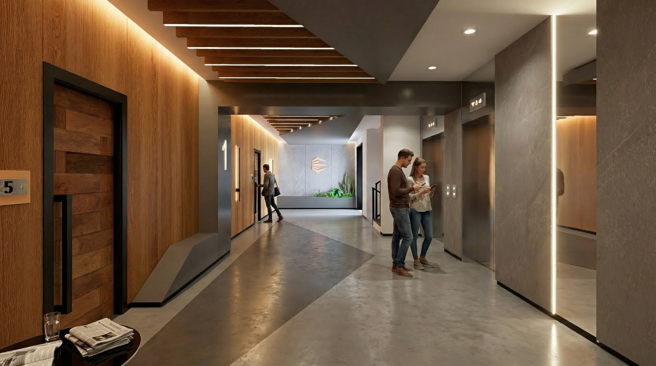 lighting is soft warm and even the tv screens have a subtle glow behind them the table tops are white the white boards are white glass with coding written on it the back wall is gray as shown in the image make right and left walls white the console is a white lacquer