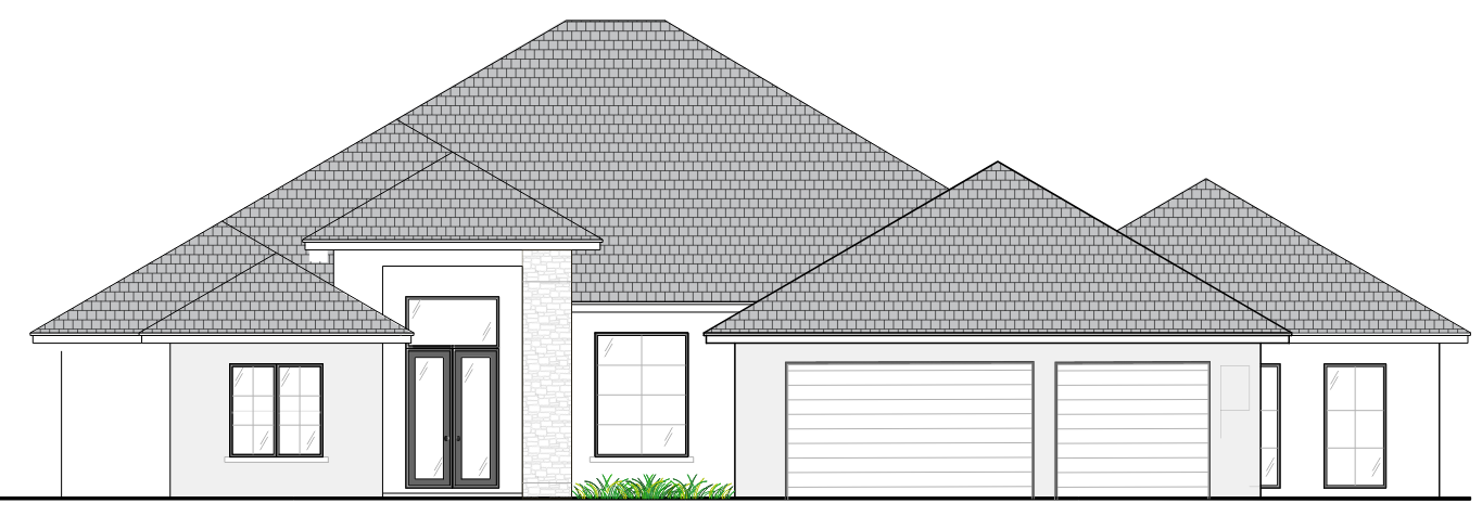 modern house with flat dark grey clay roof black frames for doors and windows white stucco on the walls and stone veneer column accent