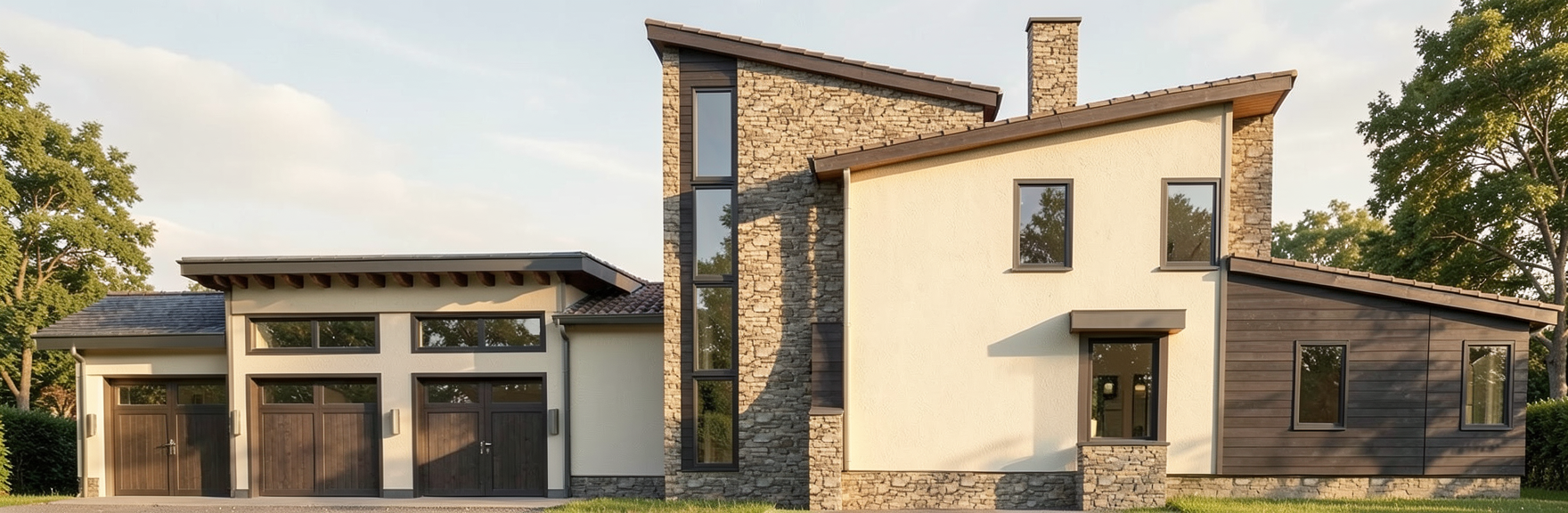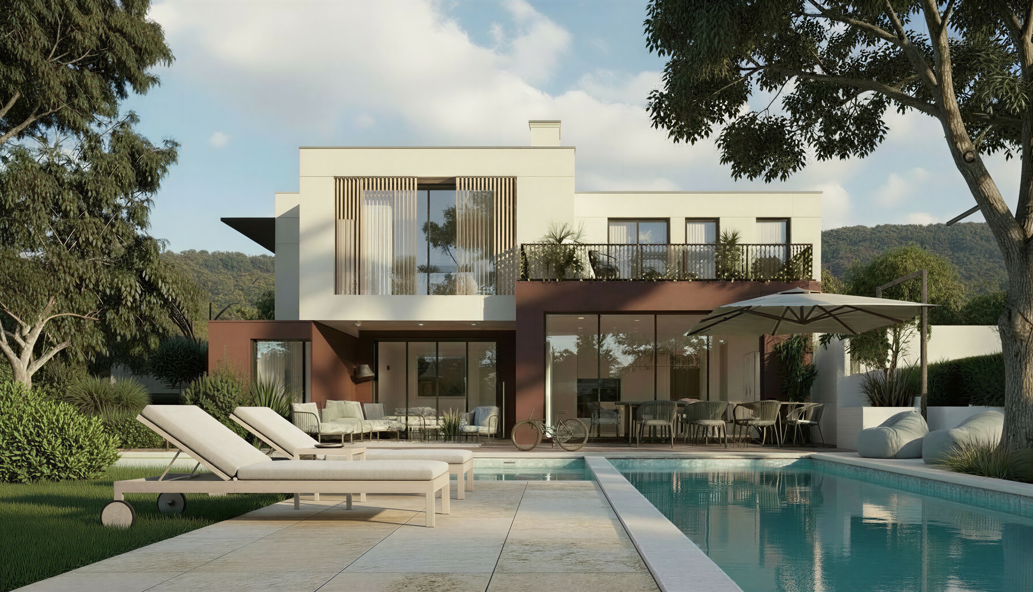 a modern luxury villa with a minimalist design featuring a two story structure the walls are a combination of warm beige and rich terracotta accented with large glass windows in the foreground a pristine swimming pool shines with a clear vibrant blue the surrounding garden is lush with deep green grass and well manicured bushes tall trees with rich green foliage frame the scene casting gentle shadows the sky is a soft a bit orange with fluffy white clouds creating a serene and peaceful atmosphere the overall mood is tranquil and sophisticated encapsulating modern elegance