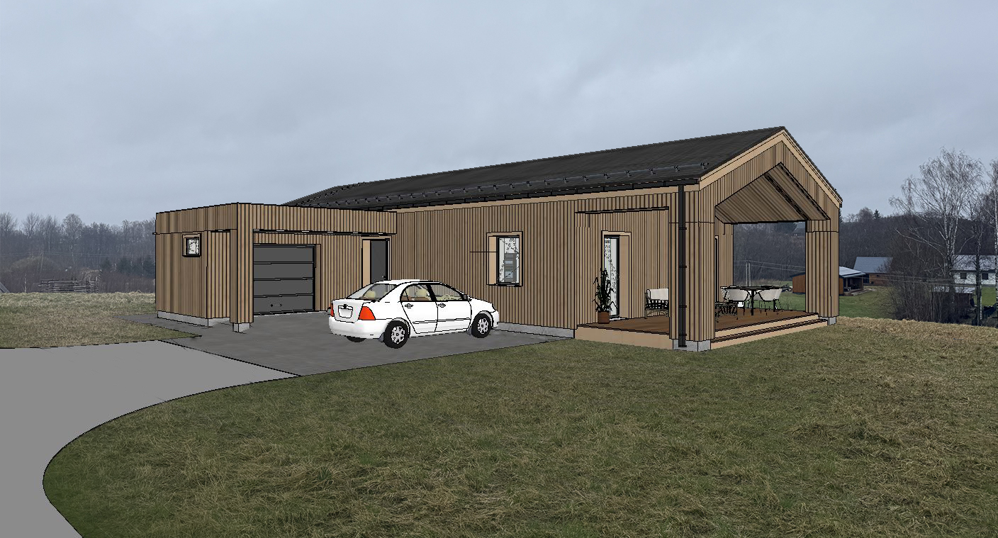 the facades are light gray beige planks the plinth is plastered with good quality darker gray plaster the roof is covered with dark gray tin change car color into black