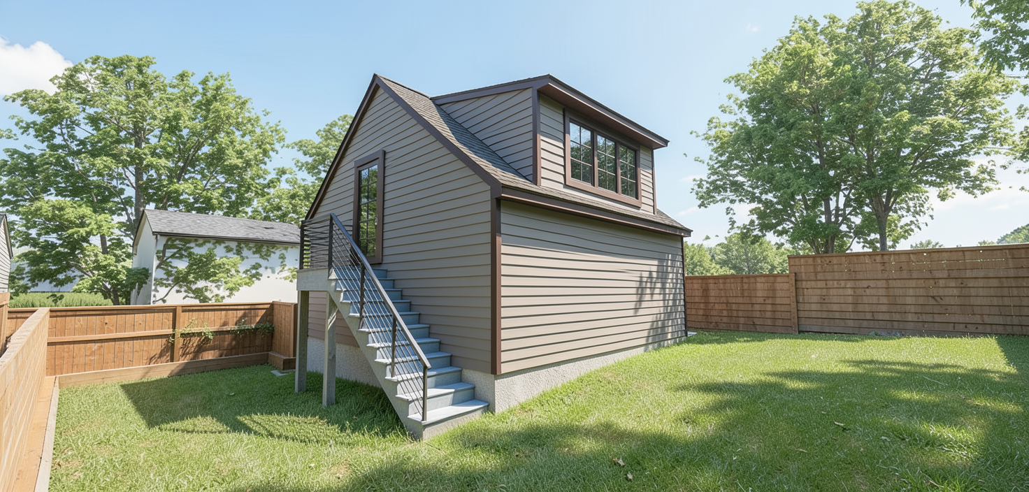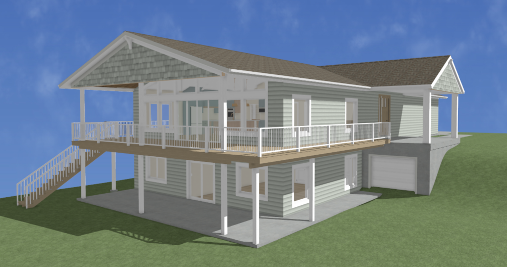 a soft gray cabin set on a slight uphill slope a light brown deck above and a concrete pad below a white garage door a light brown front door white posts around the deck a soft brown shingle roof a manicured lawn pine trees scattered behind on the hill a soft blue sky with white clouds that soften the scene