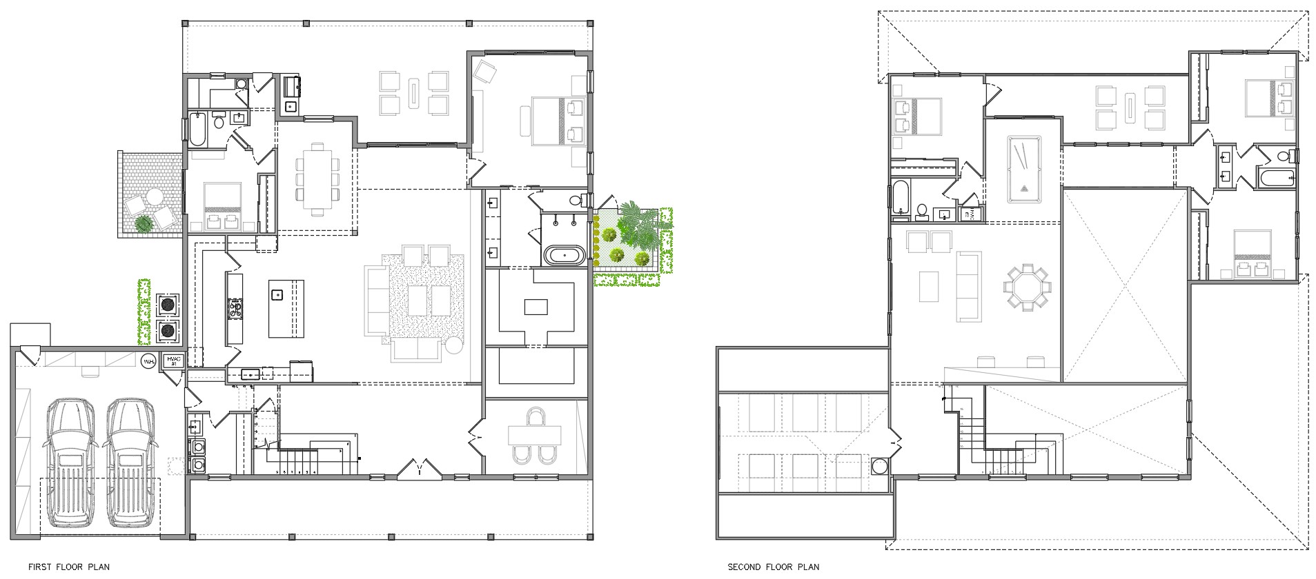 convert this floor plan into a realistic isometric 3d view of a full house show the space from an elevated angle with furniture walls and details visible generate a beautiful modern house render large two story house with a gray and white exterior the roof is soft charcoal gray blending seamlessly with the overall color scheme the siding is a mix of light gray and white for a clean and contemporary look include large windows for enhanced natural light add lush green landscaping with well manicured shrubs and small trees around the house the atmosphere is bright and inviting with clear skies suggesting a sunny afternoon use the same furniture as shows on the plan do not change the orientation of the floorplan