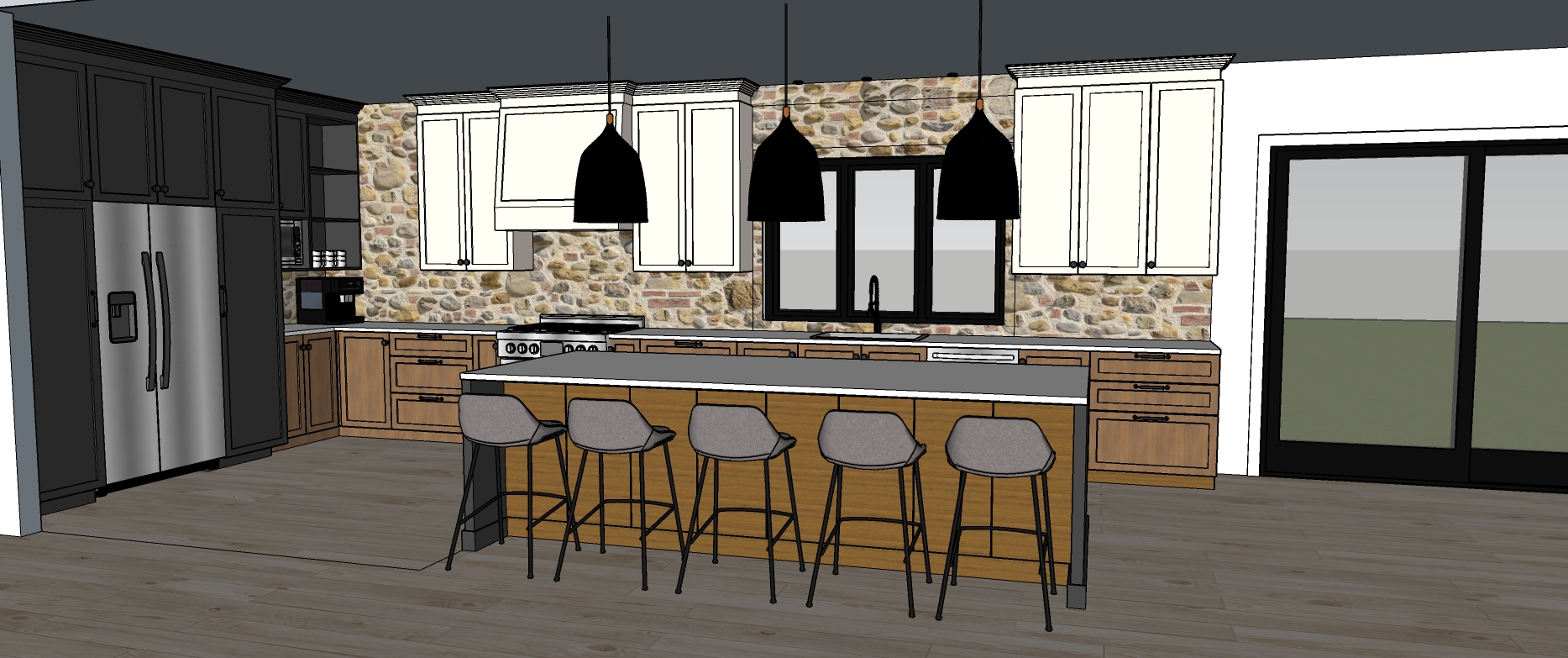 render a modern kitchen with a rustic touch the kitchen should have a warm inviting atmosphere use a palette of earthy tones and natural materials the cabinets are white with detailed trim the backsplash is a textured stone in various shades of light gray and beige while the lower cabinets and kitchen island feature warm oak wood the countertops are sleek and grey the lighting is modern with black pendant lights hanging above the island the appliances are stainless steel use natural light streaming in from large windows the floor is a natural light wood the overall ambiance should be cozy yet modern blending rustic charm with contemporary design