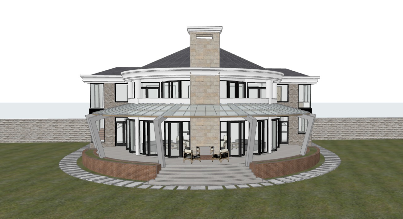 exterior shot a luxurious modern circular house with large windows and a stone chimney surrounded by a well manicured green lawn the fa ade features elegant white and light gray tones with accents of natural stone in soft beige the curved terrace is adorned with polished granite tiles highlight the large semi transparent glass panels in a gentle reflective blue the atmosphere is serene and refined with a clear bright sky overhead casting warm sunlight on the structure