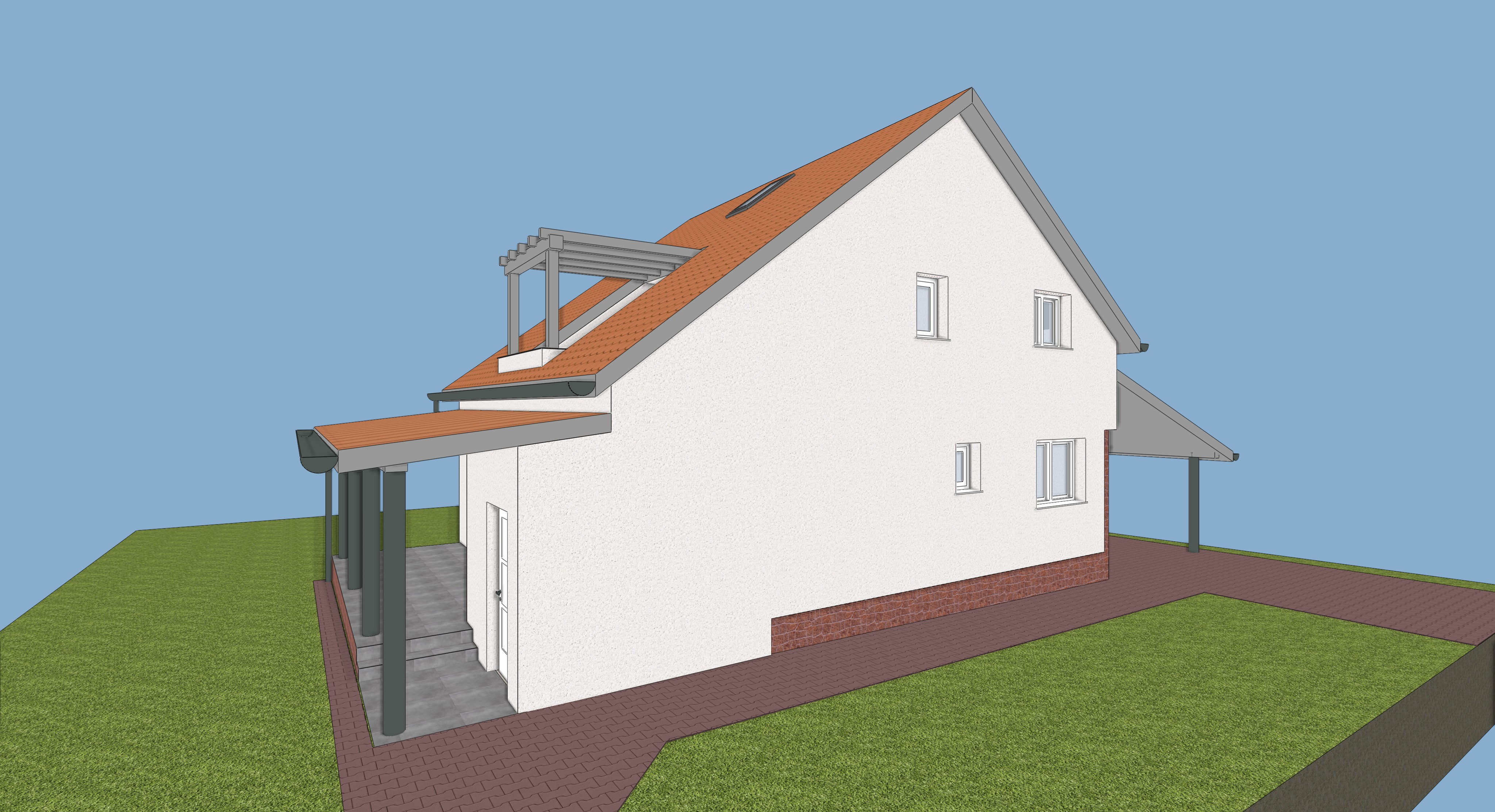 render a modern house with a red tile roof and white walls the roof features a sleek gray pergola the building stands on a lush green lawn with a brick sidewalk the sky is clear and blue creating a serene and inviting atmosphere use vibrant realistic colors to make the scene come alive with detail and warmth
