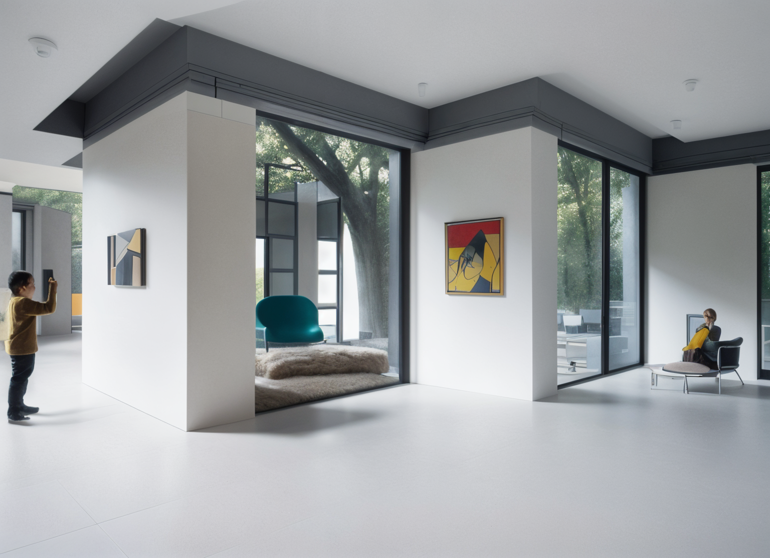 add patio seta manicured lawn layered flower beds low maintenance shrubs native plants add lounge furniture inside birds in the sky add patio set ocean background clouds in the sky curtains at room windows more plants
