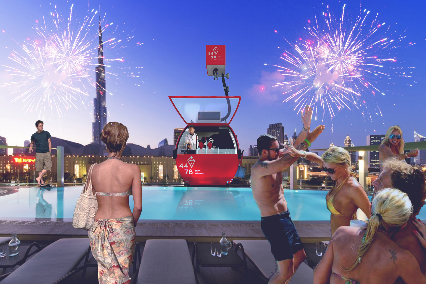 important preserve the existing geometry and the existing context exactly as provided preserve the existing windows do not add new windows do not modify alter reinterpret add remove scale or reshape any geometry do not change the site surroundings street layout neighboring buildings vegetation or context elements do not modify geometry scale proportions buildings road layout sidewalks or surrounding context in any way do not modify text soft noon atmosphere diffused neutral natural daylight with subtle cold tones cinematic architectural mood warm interior lighting 4000k glowing from inside creating slight contrast between cool exterior and warmish interior large glass surfaces with realistic reflections soft mirror effect environmental reflections of sky and surroundingsimportant do not add new windows make it darker add lights as for a rooftop party do not change the geometry from inside the gondola do not add people inside the gondola remove the people