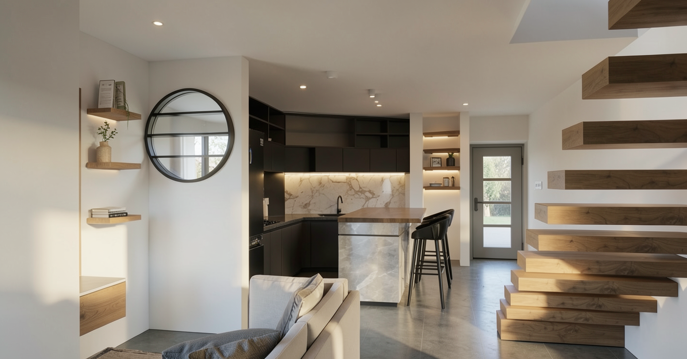 generate beautiful elevations renders with light inside with white stucco on front walls and black metal roof