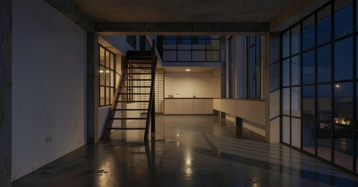 add a concealed indirect led strip in the foreground near the camera viewpoint integrated along the lower edge of the front wall or floor junction the light should softly graze the floor surface toward the interior revealing texture and reflections without flattening shadows keep the back area dominant and dramatic preserving contrast and nighttime atmosphere