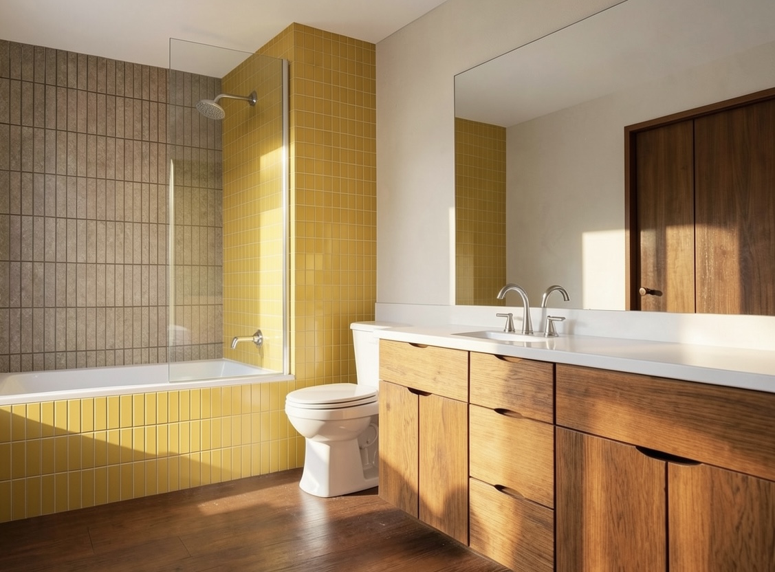 exterior shot add the light fixture to the tiled wall next to the toilet