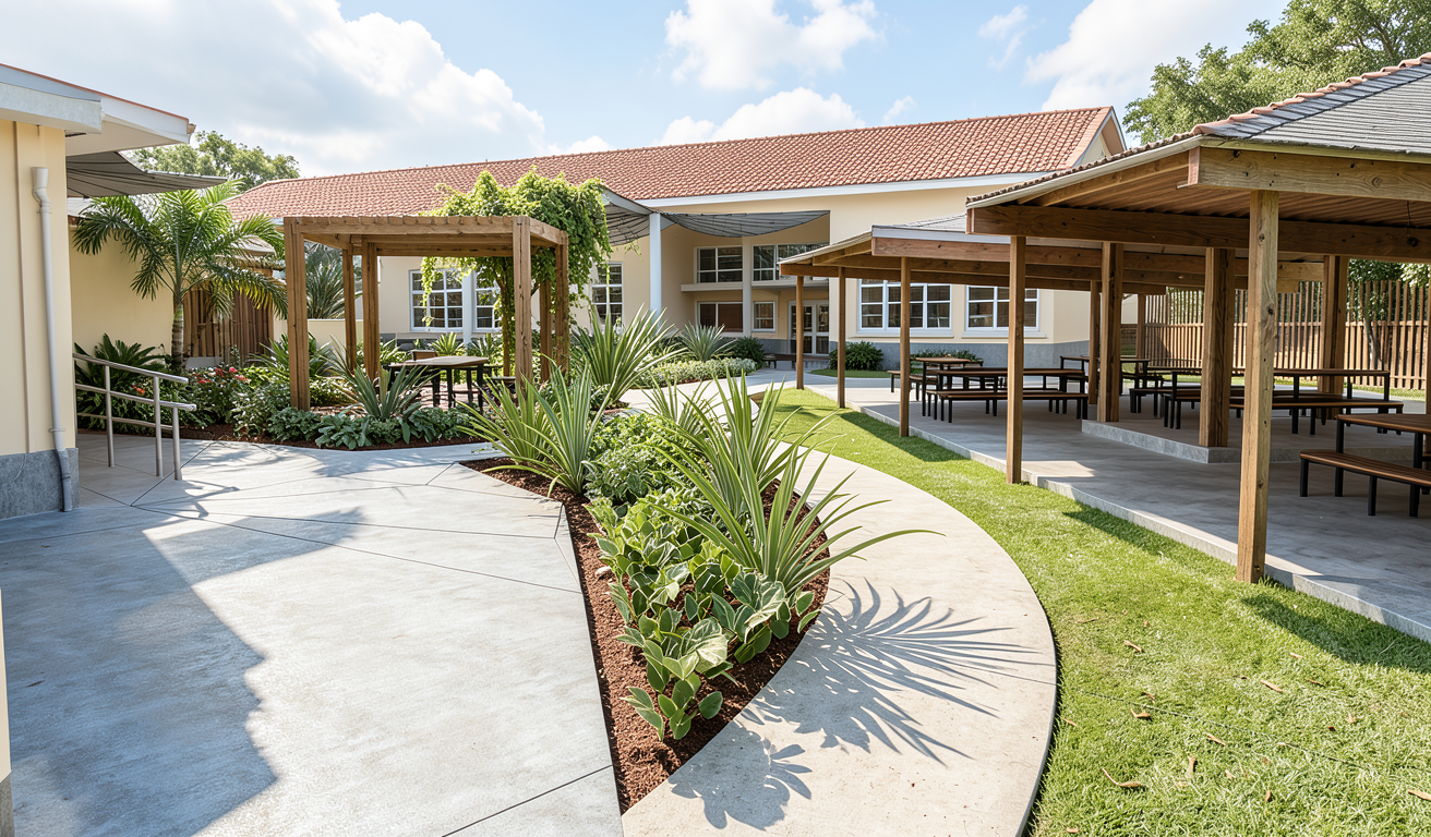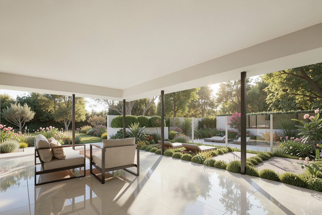 a sauna in a modern garden add some trees in the background use a soft light set during the sunset use some warm lights coming from the greenery