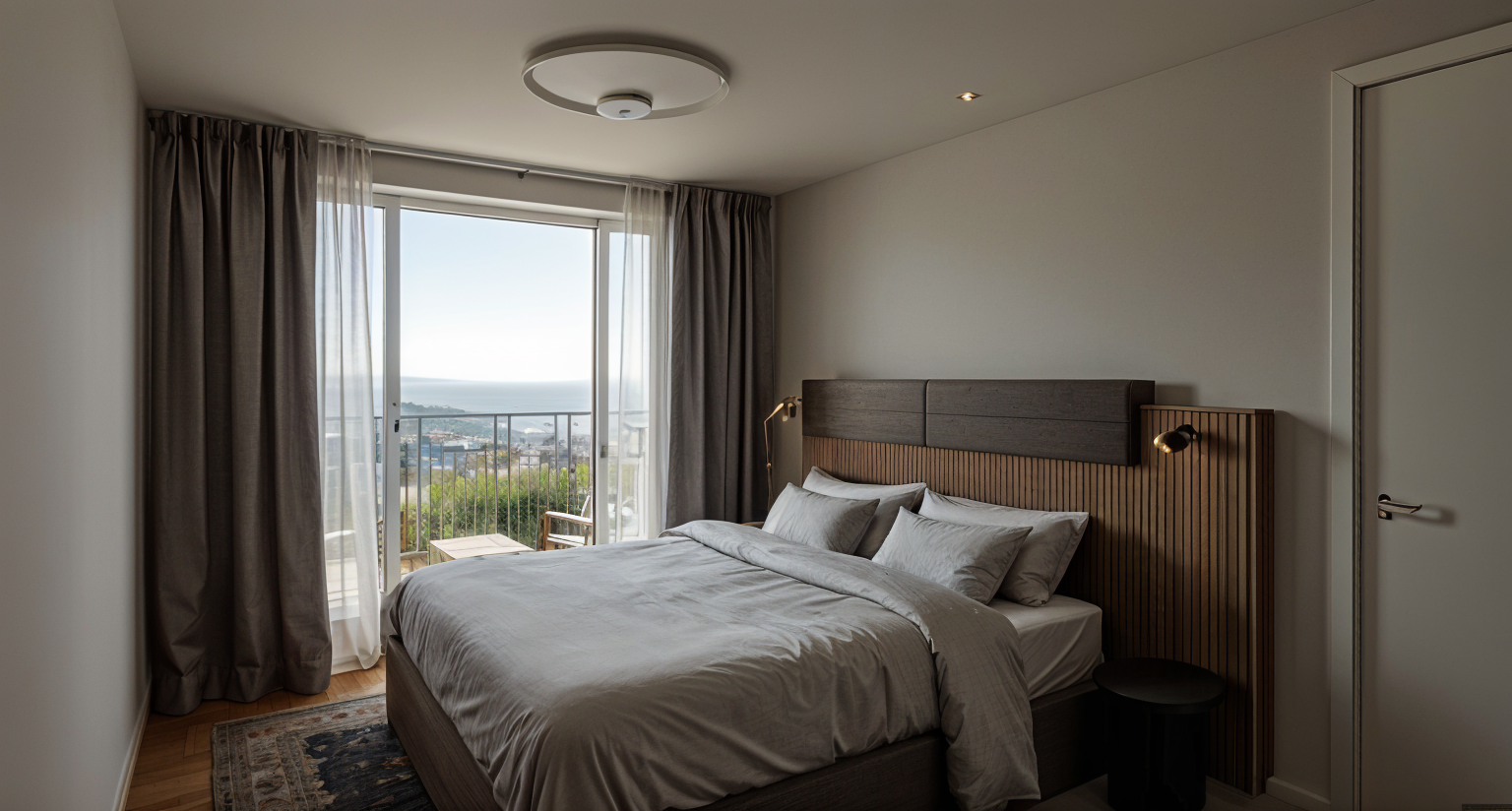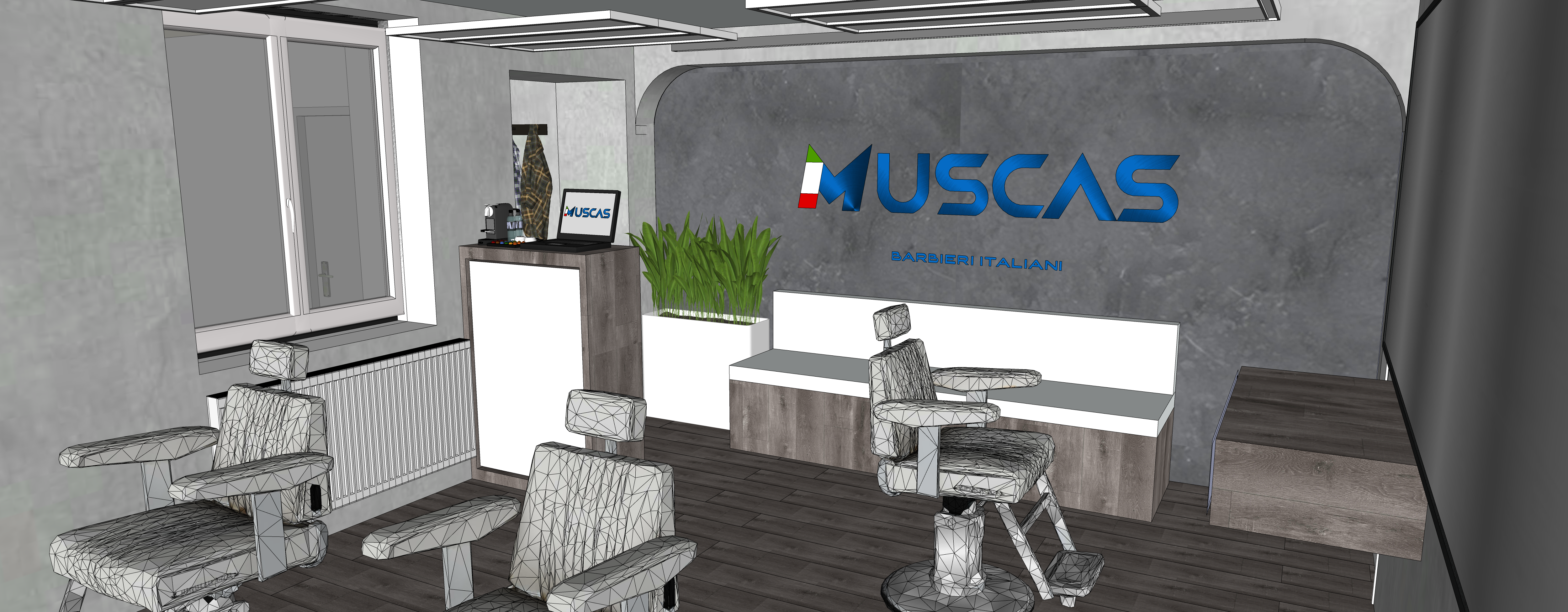 render an elegant barbershop interior with a modern neo brutalism style sleek design gray textured in the deep wall the letters in the to that wall are muscas and down barberie italiani all are in blue color steel metal with light in the back dark wood flooring incorporate plush white leather barber chairs with chrome accents countertop and counterwork with wood finish display a vibrant green plant on the countertop for a touch of nature use gentle ambient lighting to create a calming atmosphere the logo muscas on the wall is bold and modern featuring with white leds in the back place a large window bringing in soft natural sunlight