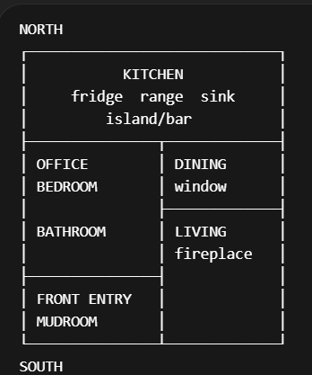 render this floor plan into a 3d floor plan drawing that will allow for visualtion of the space the north part of the space will be the kitchen the whole north wall be utilized as kitchen space and will need to include a refrigerator stove hood and diswasher i want to make use of the space to have plenty of kitchen cupboards the east side of the home is the best view and needs to be utilized as a feature wall all windows the south part of the home is attached to the garage there is a doorway to the garage mudroom area in the southeast corner of the home the southwest corner of the home will be used as an entrance to the exterior and will also have a bedroom and bathroom