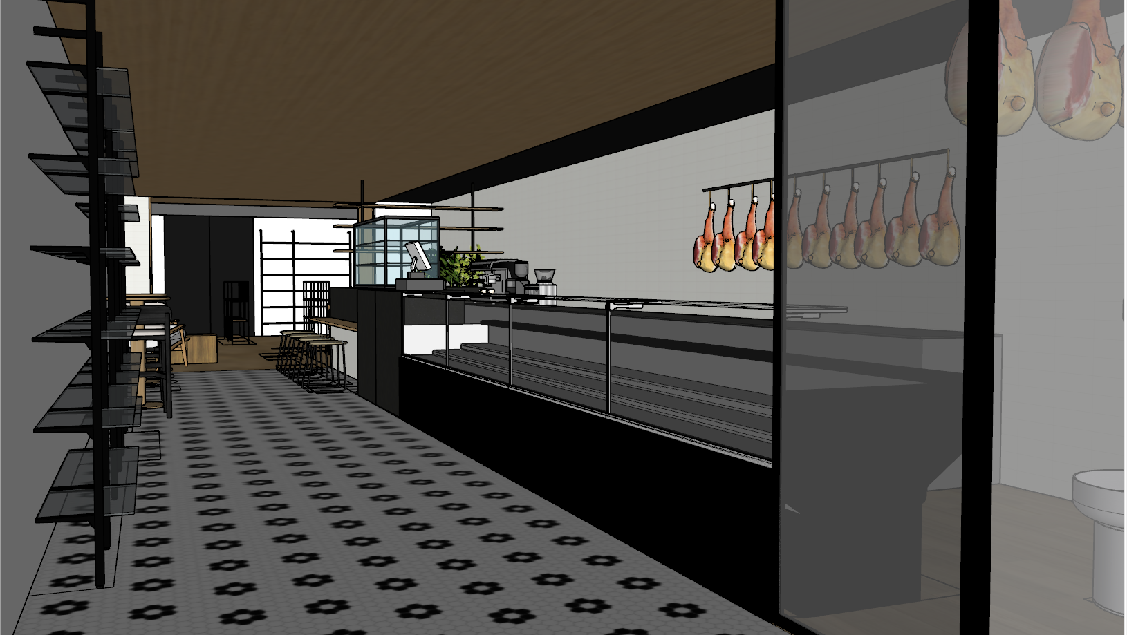 interior of a gourmet delicatessen shop specialized in iberian ham shavings ultra photorealistic render global illumination pbr materials high resolution eye level camera with 24 35mm lens strictly maintain the original spatial layout right side long black counter with a glass refrigerated display case containing trays of vacuum packed ham cuts with subtle cold internal lighting on top of the front display a metallic ham slicing machine clean and highly detailed right wall multiple hanging ham legs used as decorative elements with realistic texture and warm accent lighting front right foreground a glass enclosure revealing a secondary preparation storage area left side vertical shelving units mini market style stocked with gourmet products wine olive oil preserves bread premium snacks floor white and black hydraulic tile with a repeating geometric pattern slightly worn for realism ceiling continuous warm toned wood finish add the following elements elegant pendant lights black metal or brass placed above the counter and tables warm light at 2700k black track lighting on the ceiling with adjustable spotlights creating soft contrast partial vertical gardens on the ceiling not fully covering it with natural hanging plants such as pothos or ferns at the back a secondary mini market area with fully stocked delicatessen shelves neatly organized double doors at the back labeled clearly with minimalist w c signage materials counter in matte black finish with subtle metal details glass display with realistic reflections and slight fingerprints smudges natural wood ceiling and accents with visible grain brushed metal on machinery and lighting fixtures plants with natural variation in color and density lighting combination of soft natural light and warm artificial lighting accent lighting highlighting the hanging ham commercial style cooler lighting inside display cases slightly cold tone soft realistic shadows no overexposure style architectural photography realism ultra detailed ray tracing 4k clean but lived in atmosphere subtle realism not sterile suggested render settings render engine v ray corona unreal engine octane global illumination on soft hdri lighting subtle depth of field