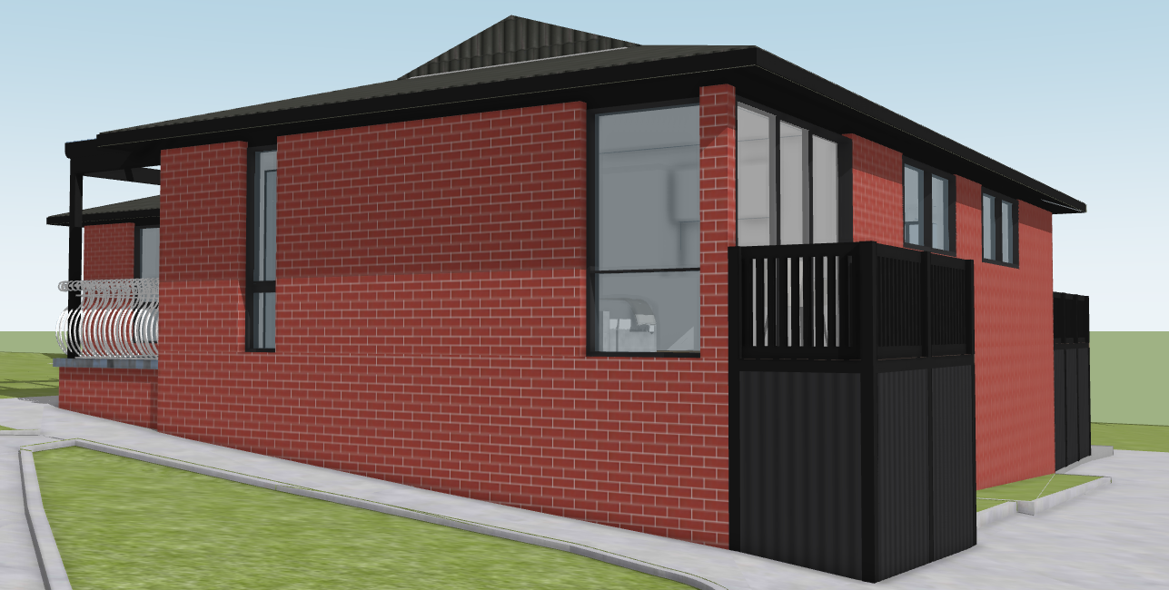 generate a realistic render of a modern house featuring a red brick exterior with large reflective glass windows on the left side the balcony railings are sleek black metal on the right side the balcony railing is black wooden the balcony subfloor is vetrical black wooden cladding the scene is set in a serene sunny afternoon with a clear blue sky the surrounding landscape includes lush vibrant green grass and a clean white concrete pathway show a wooden fence behind the house