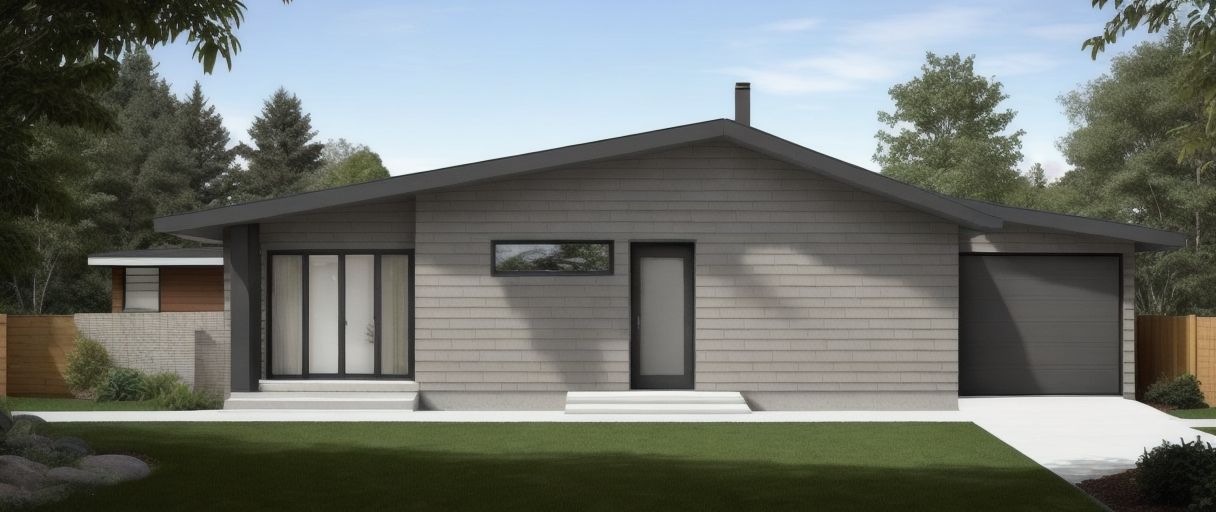 preserve the texture of the roof wide rectangular bricks beige windows dark smoked wood tree lined surroundings in the background front garden with car in the foreground make a realistic 3d visualisatieon with prerspective