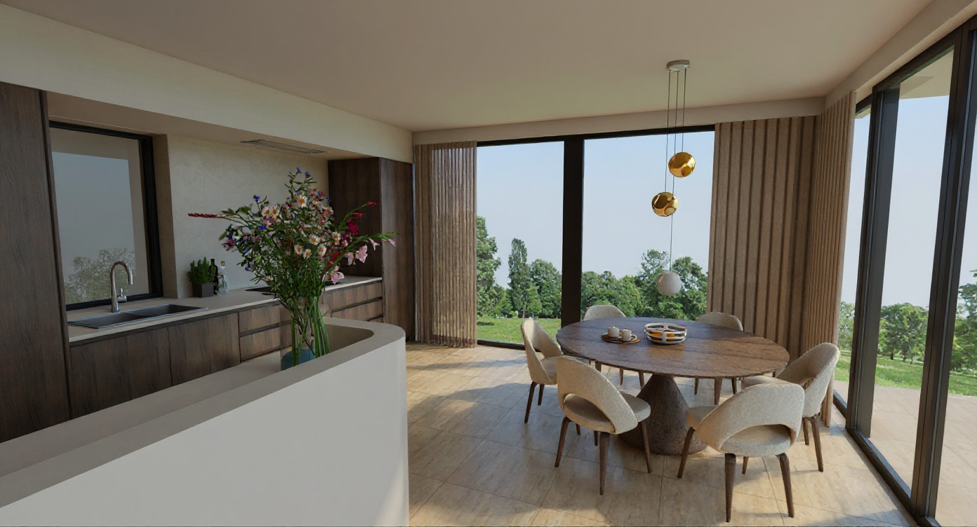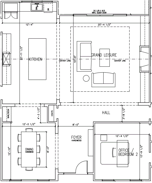use the 2d top down picture of a main living space i provided to make a main living space rendering all ceilings are 9 feet tall there should be no encasements between the living room kitchen and dining room